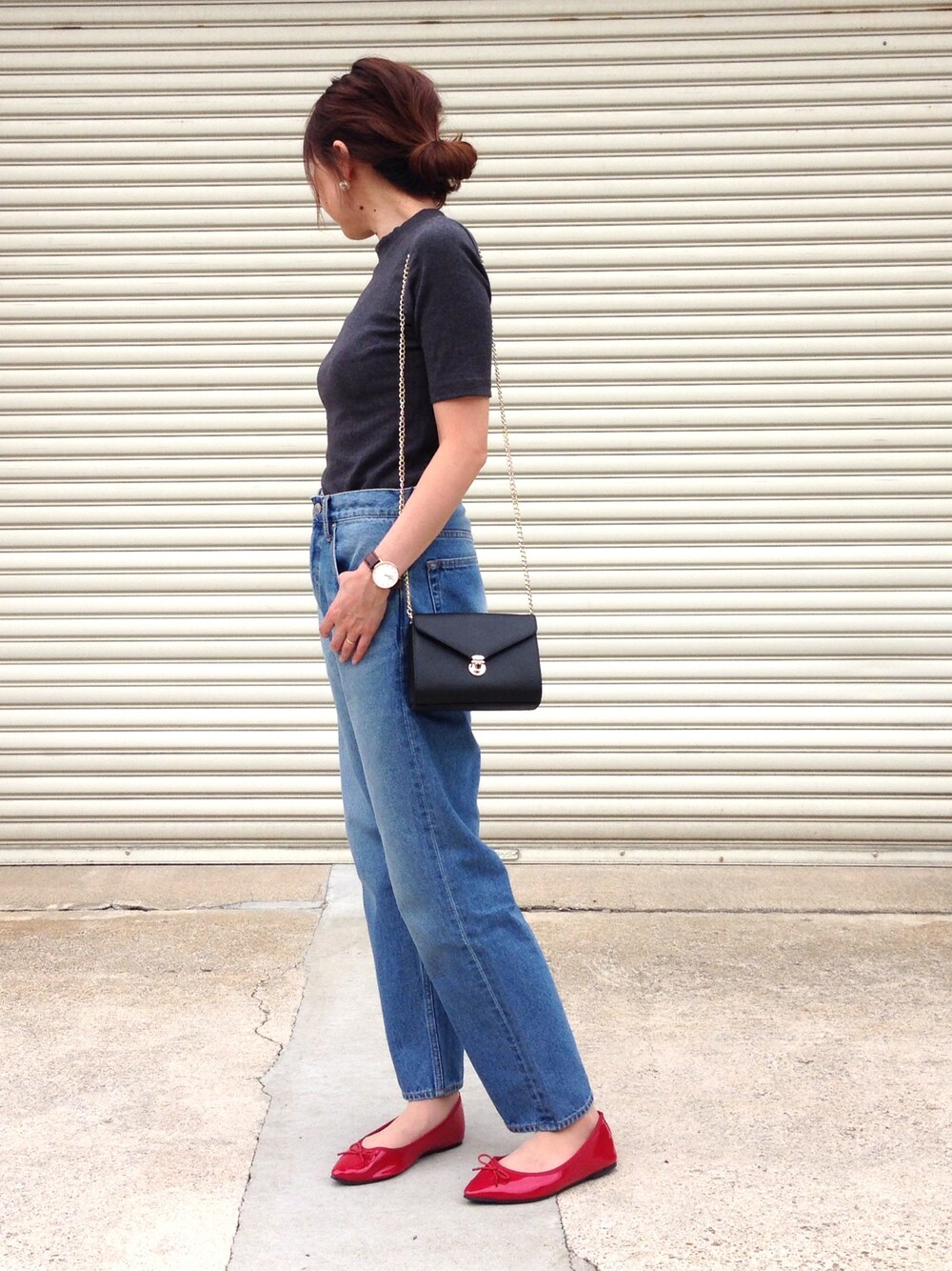 いつかのコーデ。 赤バレエがポイントです!! しかし、こういう靴って履き慣れませんね😂 フラットで歩きやすいですが😊 デニムはイロチ買いしました!! いつもありがとうございます❤️ インスタ ikunao0711