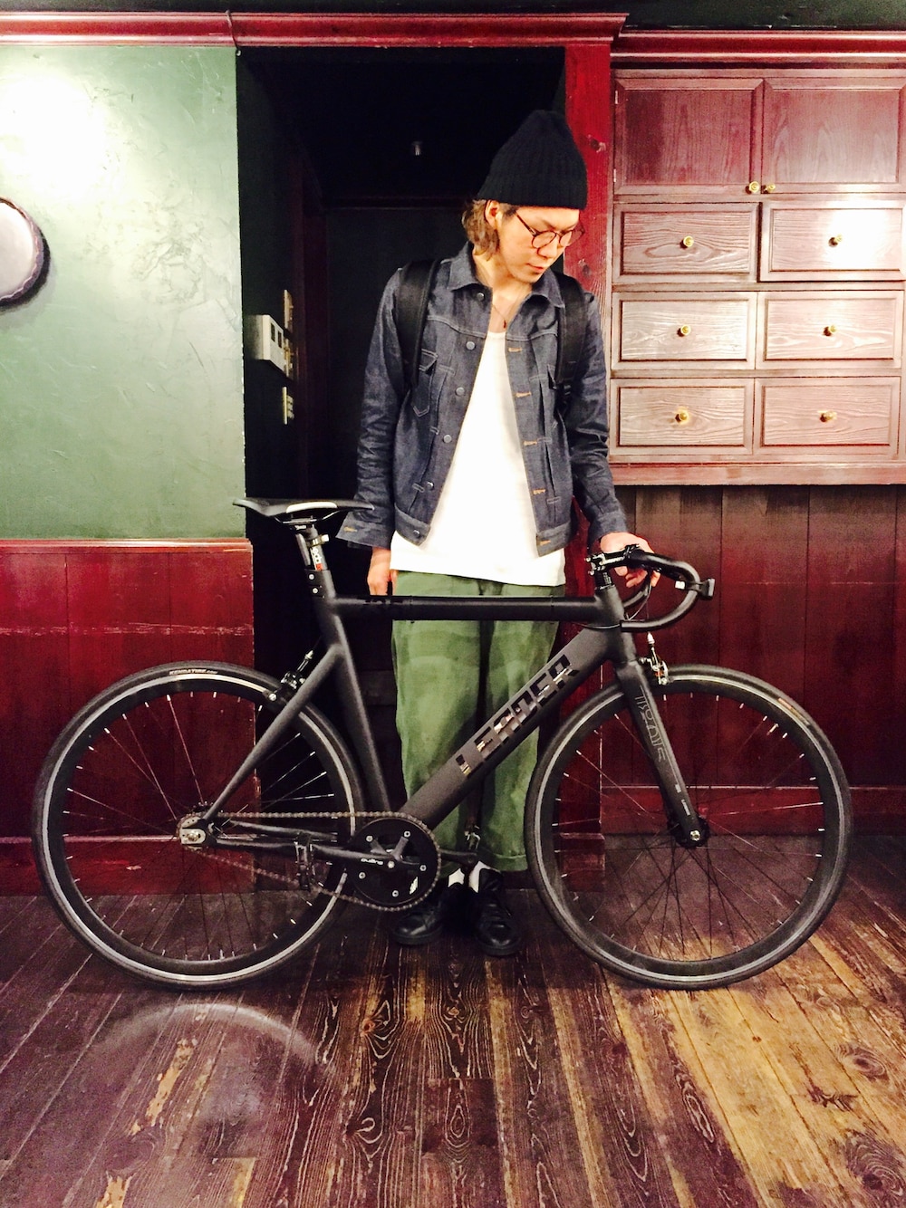 昨日、友達のところに 遊びに行きそのまま泊まって出勤^o^ いつも職場までは徒歩なのですが 自転車できました^ ^ そして明日がたまたま 自転車スタイルのタグという事で パシャり。 city boyになりたく 気合入れて買ったleader bikeです。笑