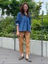【着用サイズ】ブラウス:9号 パンツ:9号 カジュアルママコーディネート。オーバーサイズで窮屈感がないデニムシャツは動きやすくストレスフリーなので、子供とのお出かけにもおすすめ。パールボタンが可愛らしさも演出してくれます。