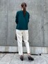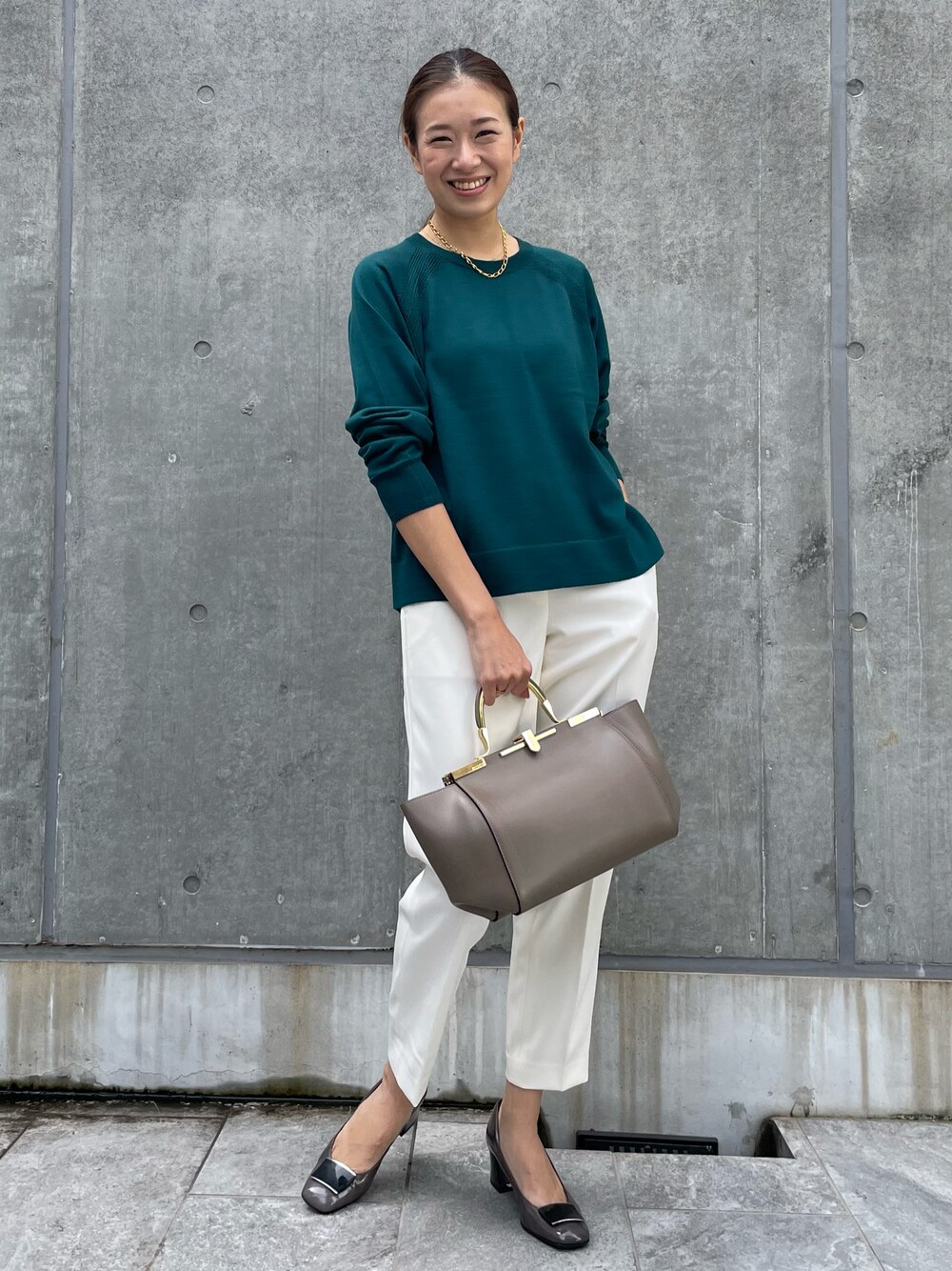 【着用サイズ】ニット:フリー パンツ:9号 秋冬のオフィススタイリング。ベーシックながらもグリーンが目を惹くスタイリング。すっきりしたコーディネートなのでジャケットなどのコンパクトな羽織も合わせやすいです。