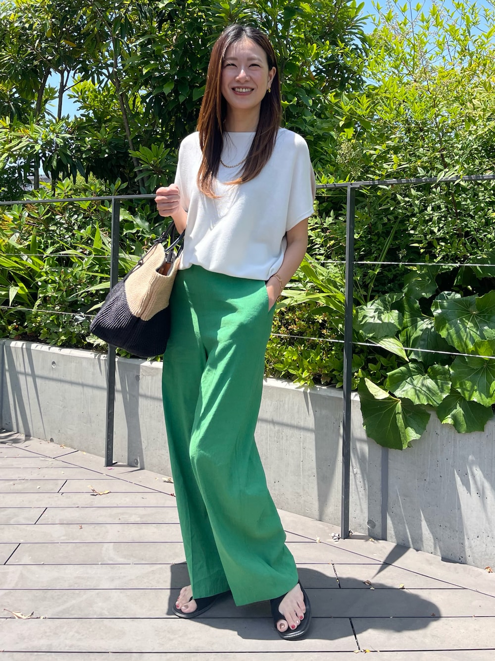 お休みの日はリラックスできるアイテムで。お友達とテラスでゆっくりランチタイムにおすすめのコーディネートです。