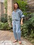 デニムセットアップスタイル。カジュアルにかっこよく。定番のデニムですが、デザインのあるジャケットとパンツでトレンド感満載に。休日のお出かけやレジャーにおすすめです。