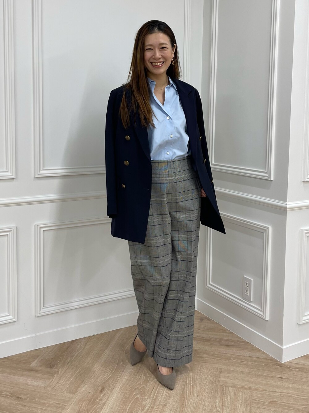 季節の変わり目の1枚着、羽織、レイヤードスタイルと幅広く活躍するブラウスはダークトーンになりがちな秋だからこそ爽やかなサックスカラーを合わせました。寒暖差のある今の時期はジャケットで調節。