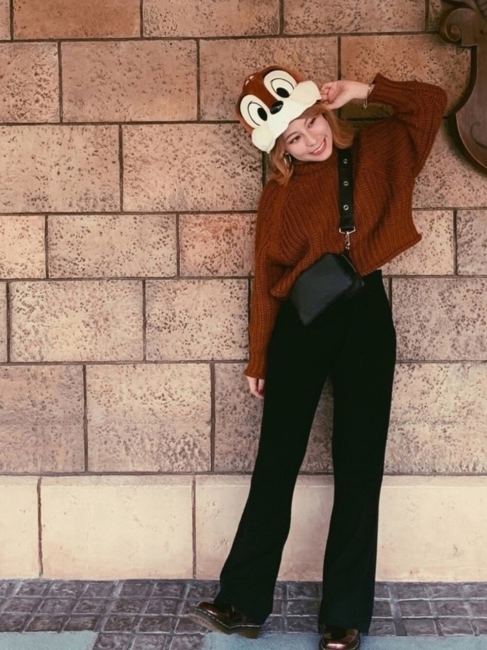 自粛でディズニーにはまだ行けないので😢去年の秋の思い出コーデ😌🍁🍂 チップを意識してブラウンのニットをモノトーンでコーディネート ハロウィン当日に行ったのですがみんなの仮装がすごかった😳✨👻 はやく行けるといいな〜😚