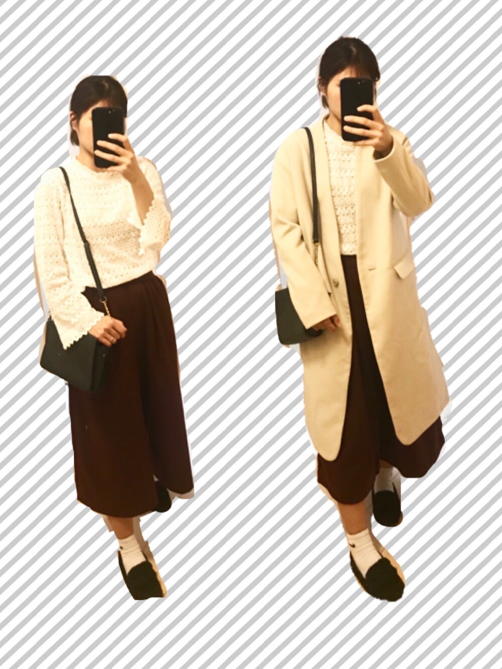 ぽかぽか暖かい日コーデです💕 でも冷えてきたら コートをon❄️☃ ボルドーワインカラー お気に入りパンツです🙇♂️🙇♀️ トップスとコートは白で統一です✌️