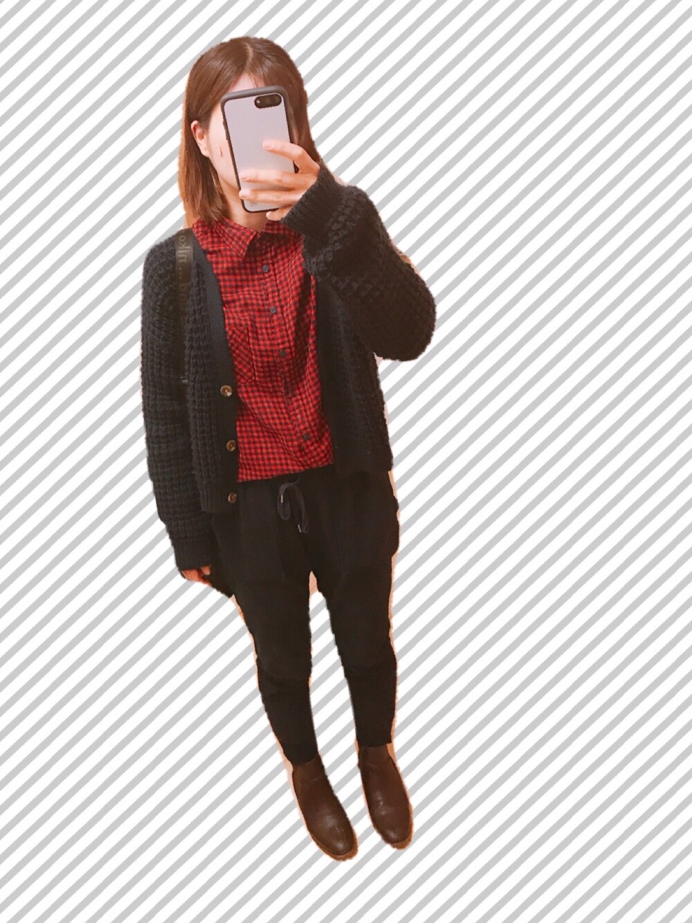こんばんは🧚♀️ ネイビー×レッド ワッフルカーディガン最強です☺️ やっと背景消せるようになりました 全部なおしたい😬😬😬😬