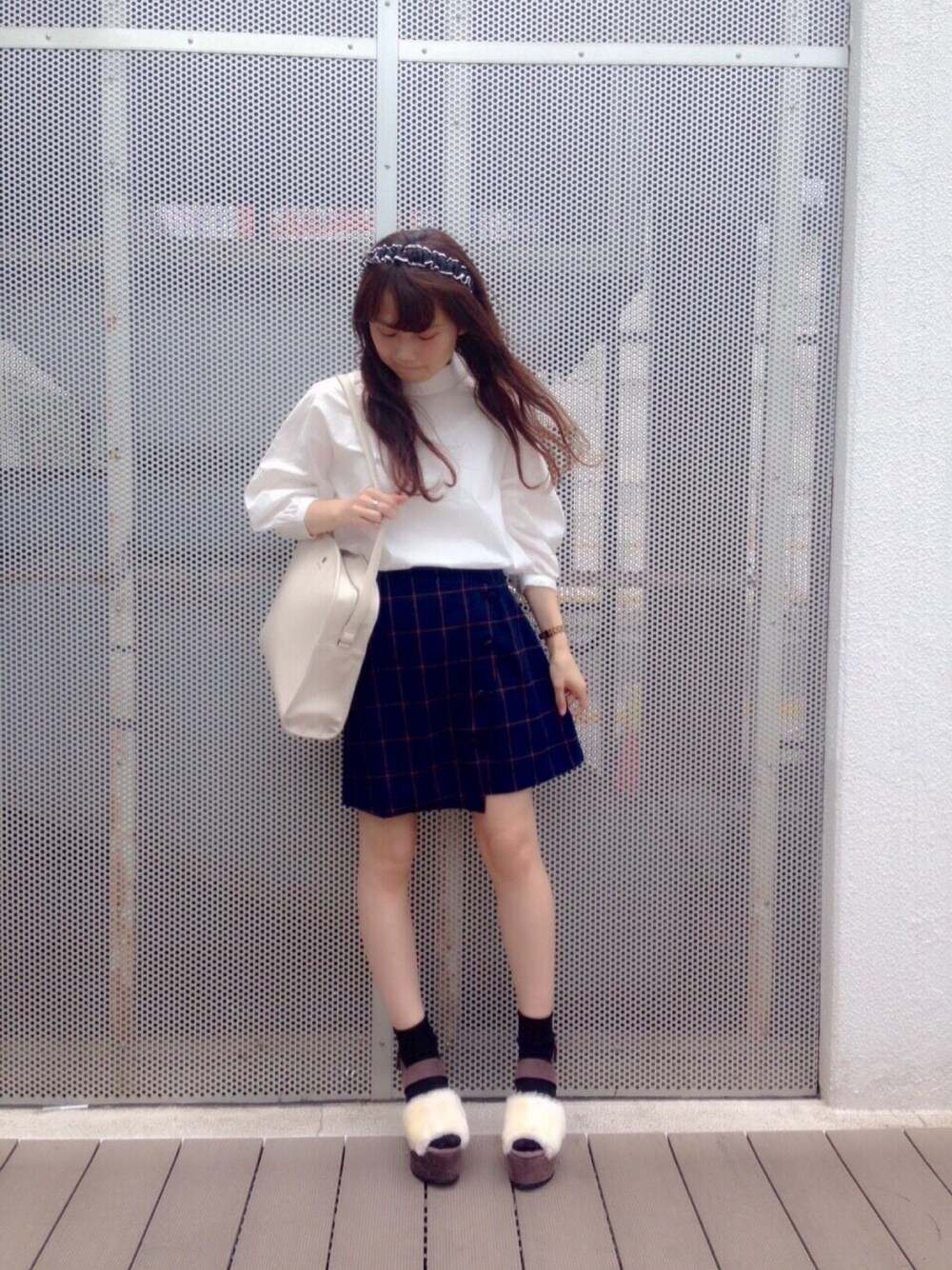 袖にボリュームのあるブラウスに チェックスカートで大人ガーリーに。 ファーサンダルやはり可愛い。。♡