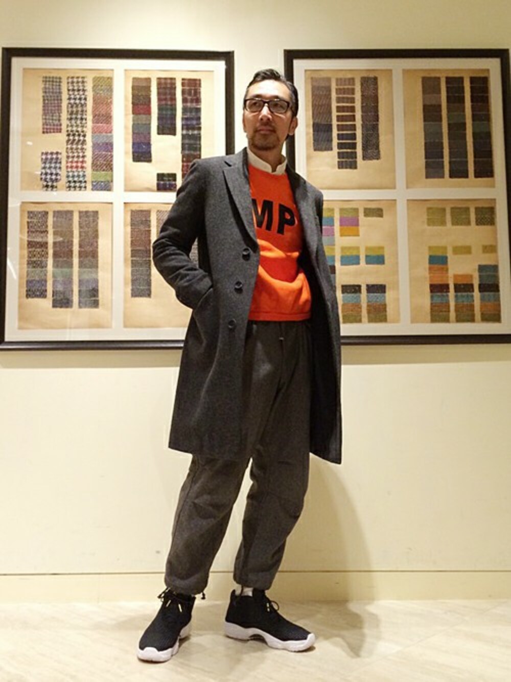 この秋はグレーをベースにしたコーディネートが気になります。リラックスしたスポーティスタイルにチェスターコートを組み合わせ、大人のスタイリングにしました。モノトーンの組み合わせにオレンジをアクセントで取り入れて、メリハリを付けています。