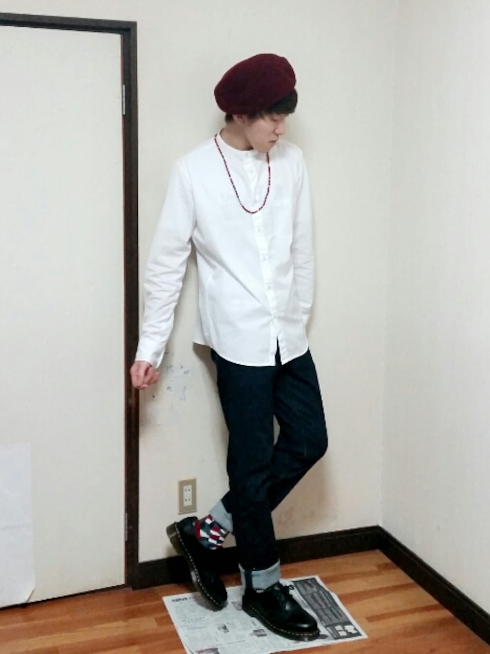 こんばんは! 最近はほんと寒いですね~😅 実際風邪ひいちゃいましたし笑 まあそんなひどくならなかったので、良かったです( ´_ゝ`)地道に治していきたいと思います😊 さて!今日は僕らしくない?どっちかな?笑 王道の白シャツ×デニムコーデです! でも白シャツはノーカラーの白シャツです👍 普通の襟ありとはちょっと違う雰囲気ですよね(^^) そしてポイントはアクセント使いです! ボルドーのベレー帽、赤のビーズのネックレス、赤系のソックス、赤で揃えました! 統一感も大事です👍笑 そしてマーチンで品を補いました(^^)d まさにきれい目の王道コーデですね!笑 気に入っていただけたら、いいね、セーブ、フォローよろしくお願いします! コメントもどしどしお待ちしております! それではまた🙋