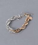 ニット素材のアイテムを取り入れることで、晩夏を感じさせるコーディネートにしました。シルバーラメが印象的なスカートなので、アクセサリーはシルバーだけでなくゴールドも入ったコンビのものを選び、アクセントをつけました。
