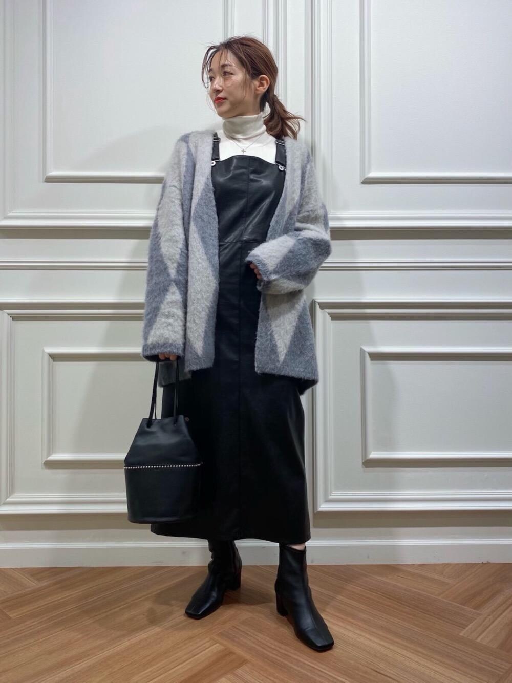 フェイクレザーのジャンパースカートでトレンドを意識したコーディネートにしました。小物も、スカートの金具と色味を合わせてシルバーで統一しました。
