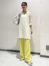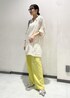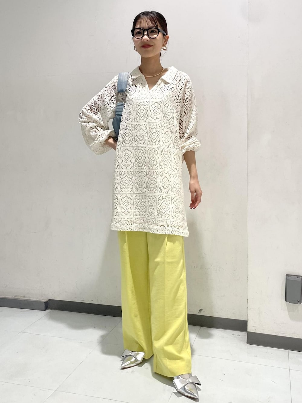 レースのミニワンピとイエローのパンツで春っぽいコーデにしてみました。 小物はデニム地のバッグとシルバーパンプスでポイントに。