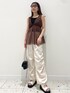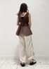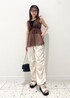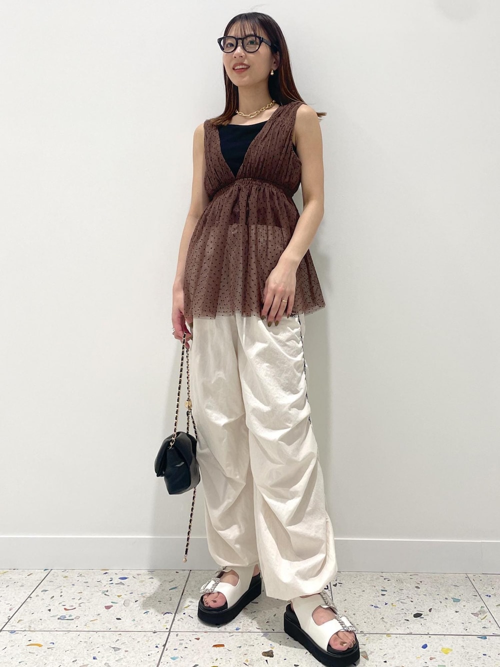 フェミニンなチュニックにスポーティーなパンツ合わせがイマドキ。 ビジューやリボンモチーフの小物でかわいらしさも取り入れカジュアルすぎない印象に。