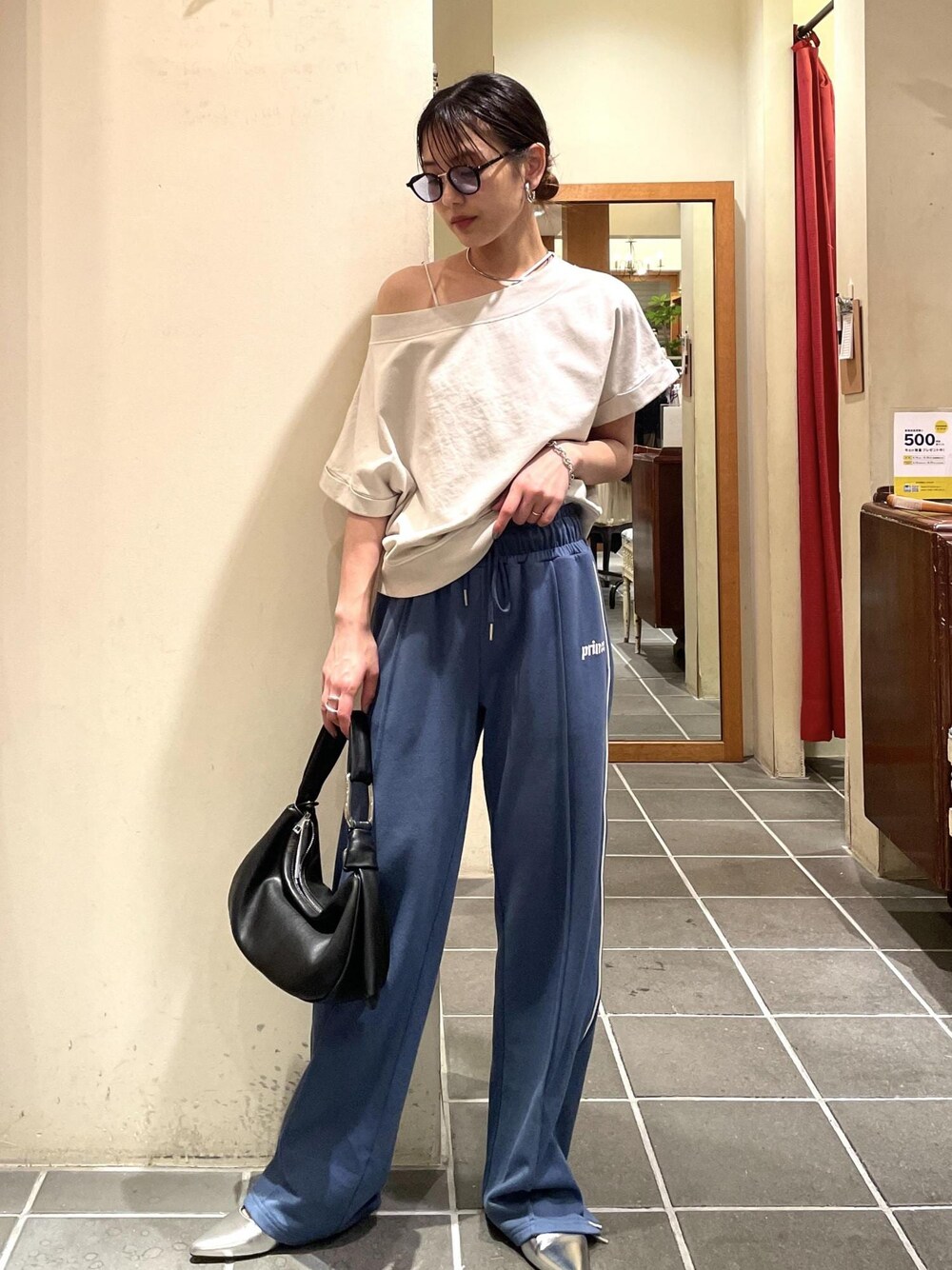 The カジュアルなスタイリングですが、ワンショルにしたり足元はシルバーで合わせたりと女っぽさ+抜け感を足すと今っぽいスポーツミックスコーデに。 パンツはprice別注アイテムで柔らかく動きやすい着心地でした◎