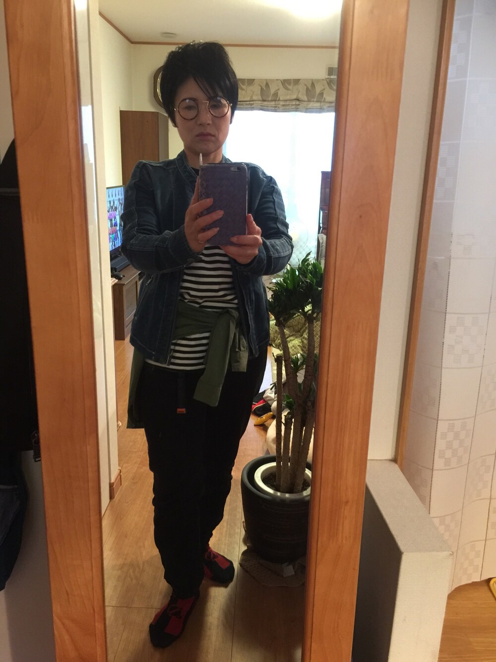 いつもと違う鏡で撮ったけどやっぱ暗いなあ😅 古着屋さんで買った伊達メガネお気に入り✌️