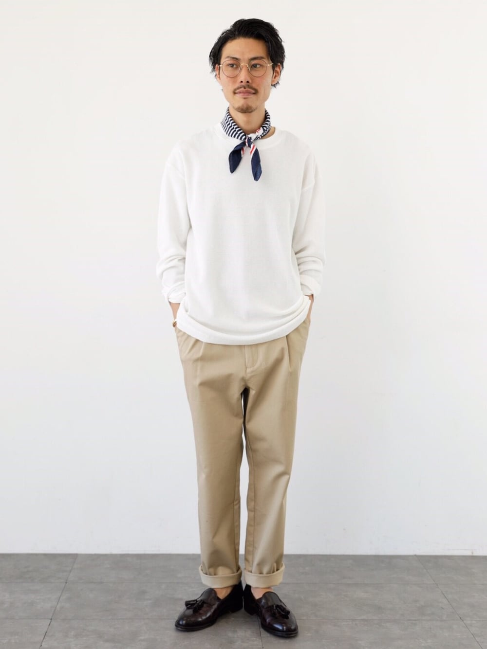 シンプルが一番いい❗️ ホワイト✖️ベージュが定番だが落ち着きます🤗🤗 トレンドのビックシルエットを合わせてラフ感を演出😎😎 足元もローファーで大人カジュアルに✨ バンダナが推しポイント⚓️⚓️