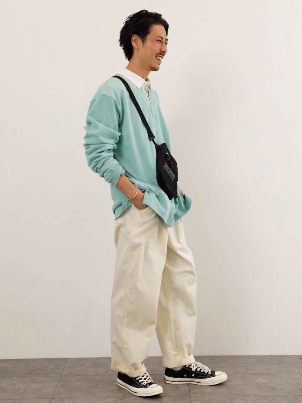 爽やかなミント色のラガーシャツ🌿 春コーデに持ってこいのカラー🤗✨ パンツに白色を持ってきて、小物を黒色で締める事でまとまり感が😎😎 ラガーシャツは重ね着でも使えるので1枚あると重宝します🙆♂️ 大きめに着るのがポイント🤩🤩