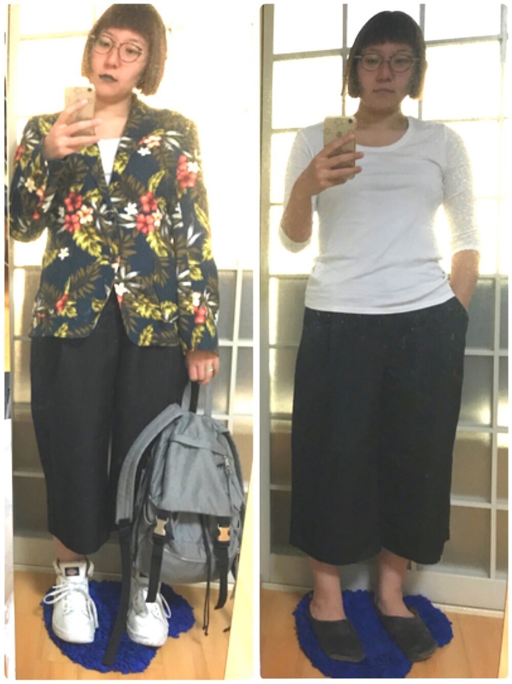 着まわし三連続。一発目。 いいね、お気に入り、コメ、フォロー、ありがとうございます😆🐚🎶 久方ぶりになります。こんばんは、みひろです。いいね返しまだでごめんです(>_<) いやー。この主張のあるチャラいジャケのコーデが溜まって、どうバラバラに更新するか、を迷ったんですが、気付くと3つ溜まっている…これ、着まわし紹介とかできるやつちゃん?でも今思ったけど似たようなコーデ連発と思われてフォロワー減るやつちゃん? …決行!(笑) これはUネック白七分袖ロンTに黒ガウチョ。リュックにゴツめ白スニーカー。チャラい。ちょっと唇カーキでちょっと変なキャラ注入。モードって感じてもらえたら嬉しいが今のモード知らんし。私の青春時代のモードのイメージひたすらモノトーンで変形した服。今の最先端ハイエンドって何? 昔のそんなイメージからか、ジャケを脱いだらなんか自分がモードに見えたwww髪伸びる前だしカーキ唇だし。