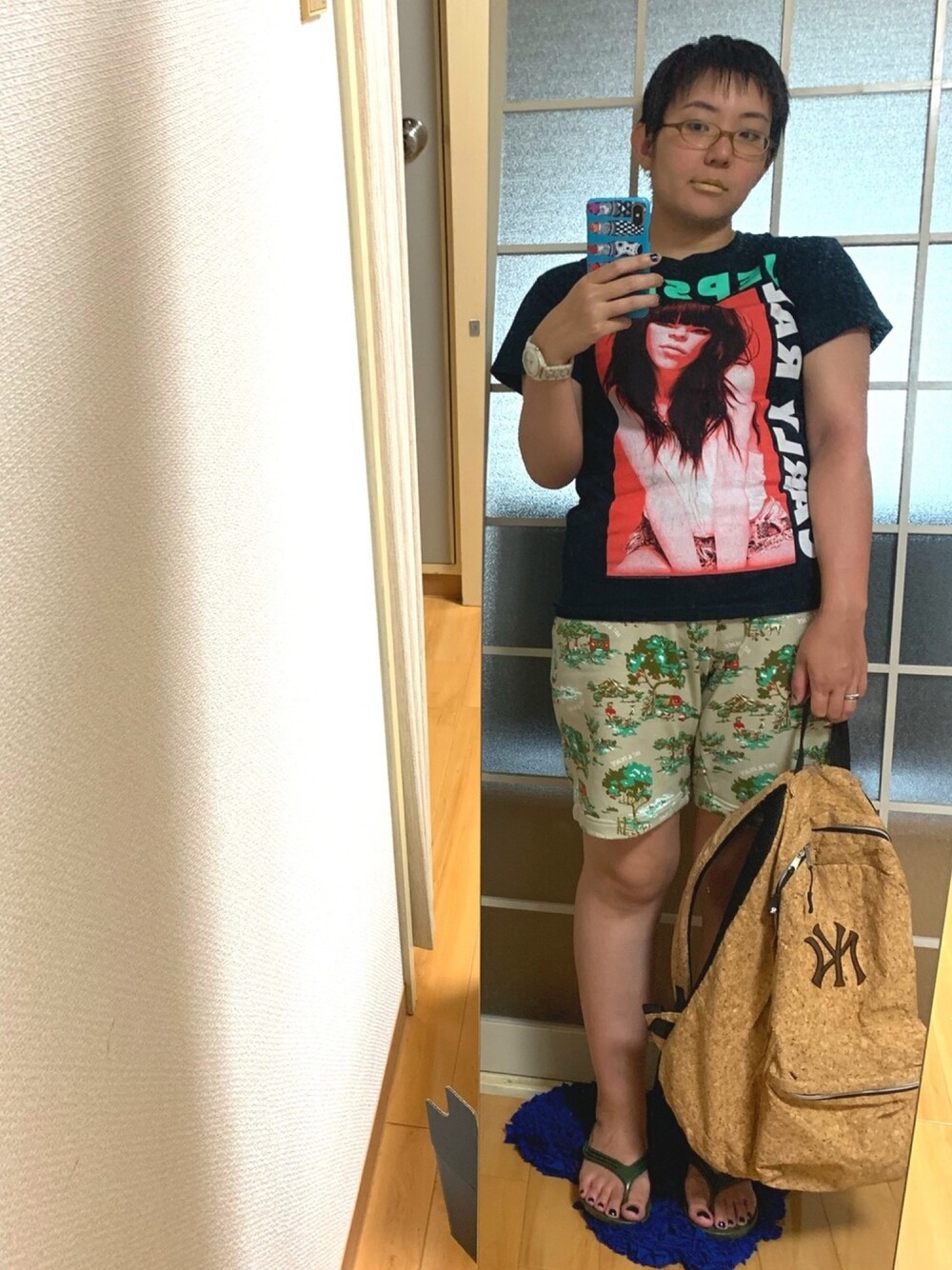 柄ハーパン3連発プラスアルファ更新、①。 いいね、お気に入り、コメ、フォロー、ありがとうございます❣️💗🍃 お久しぶりです、おはようございます、みひろです。 ...このハーパン、前に白シャツと合わす!とか言ってたけど、手持ちで試したらシャツがカッチリ真面目過ぎて合わなかった...。から止めた。 黒Tに合うやん、簡単やん、て話に思えますが、私にとって...何故か...何故かプリント黒Tですら、ガチャガチャして...見えるんです...おっしゃりたい事は分かります...お前散々柄柄コーデしてきたやんけ!!!( д) ゚ ゚しかも統率取れてないやつ!!と...。多分ねー、柄ハーパンの柄が情報量多いんですよー、幾何学じゃなくてもう絵柄が載ってるから。そこにプリントTだと意味のある情報が過多に見えてきちゃって。今見たらこのコーデは平気なんだけど黒Tもワンポイントじゃなくて柄模様になったらうちは違うかなと思う。