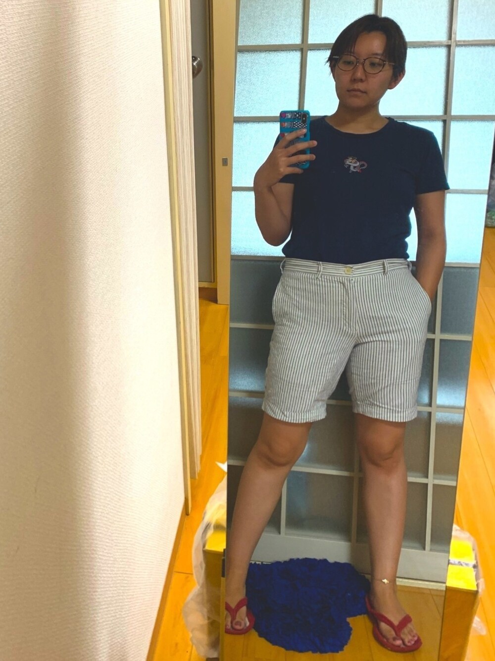 多分これも真夏の掃除コーデ。 こんばんは、みひろです。 龍ワッペンの紺T。龍の配色がガチでヤバめ🤣wwwダサい‼️‼️‼️厨2感すら漂う‼️‼️‼️でも自分リメイクだから可愛い💙🤣洗濯したら剥がれかけたけどまた圧着しました😌💙