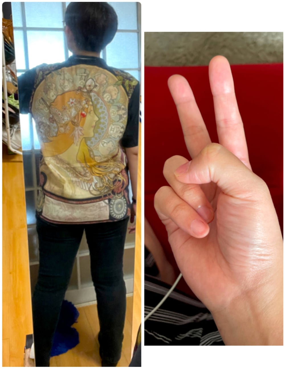 ずっと着たかったミュシャシャツー‼️ いいね、お気に入り、コメ、フォロー、ありがとうございます💚️️️🍎🥰 こんばんは、酩酊みひろです。 ももこさんとルクアのグラニフに行くが無い。地元寄りの店でも無い。でも諦めきれずに通販しました。ミュシャのシャツ。 とっっても...カッコイイ...。 初おろしは人前でお披露目すると誓っていたので、着るのが遅くなってしまったけど...くっ、クッソカッコイイ...‼️元々メンズだし、シルエットがまた...😭くぅぅ‼️明日も着ようかな...明日何着よう...。 前身頃がシンプルな分、パールアクセで盛ったんですが、なんか浮くから、ももこさん譲りの黒ビーズのネックレスも添えました🙂🖤上手く中和した。パールを浮かせて目立たせるのもアリだけど。男子パール企業が流行らせようとしてるし。 ああ...ミュシャワンピも気になる...クリムトワンピに比べたらあんま仕上がってないけど、コレクター欲が刺激されてる...。あっ明日ワンピにしようかなー🥰 メイクはGina付録パープル💜