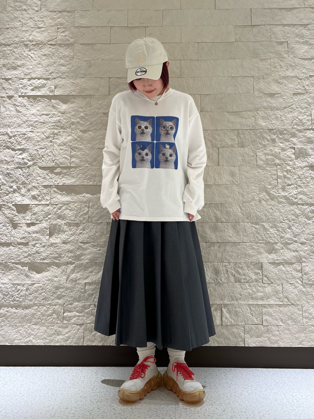 ねこがプリントされたキュートなスウェットをメインに、靴がピンクで差し色になっているのでシンプルなアイボリーカラーのキャップを合わせました🐈🪷💭 キャップのロゴも本体と同色なので合わせやすいです! instagram @or_29c