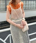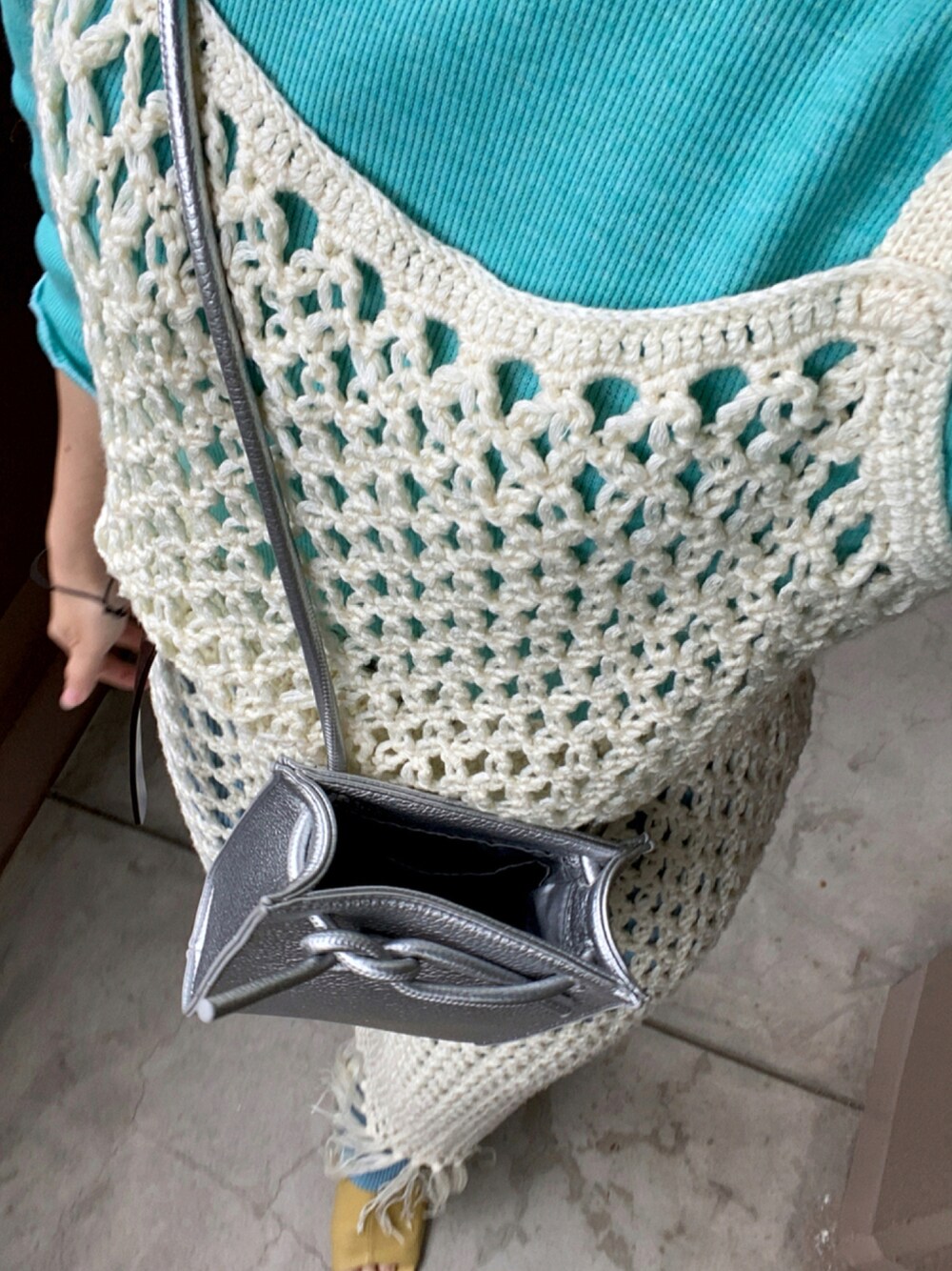 kastaneのマクラメ編みワンピース、低身長の私にはそのまま着るととても長く地面についてしまうので、フリンジ部分をカットしウエスト部分にベルトをして丈を短くしています♪ そして、ヒールを履いて服が地面につかないようにしています! パンツはカットできるものなので、低身長さんでも履けます!