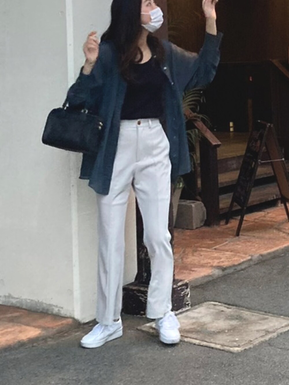 グレーのストレートパンツと白スニーカーで脚長効果抜群🤍