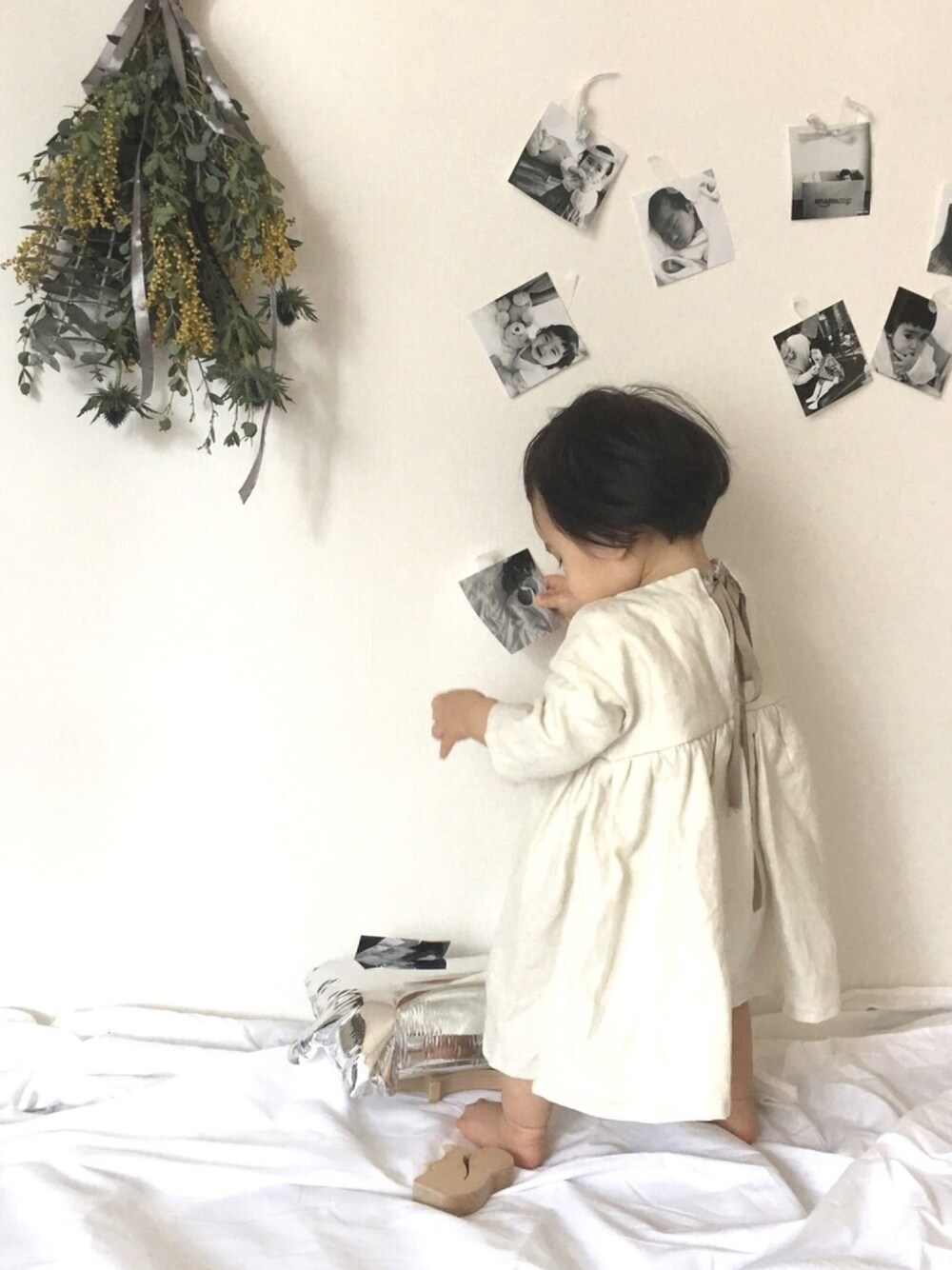 後ろリボンのリネンワンピース🎀 ママメイド🙋の服と パパメイド🙋♂️のスワッグ💐 何もわからず飾り付けを破壊していく娘👶