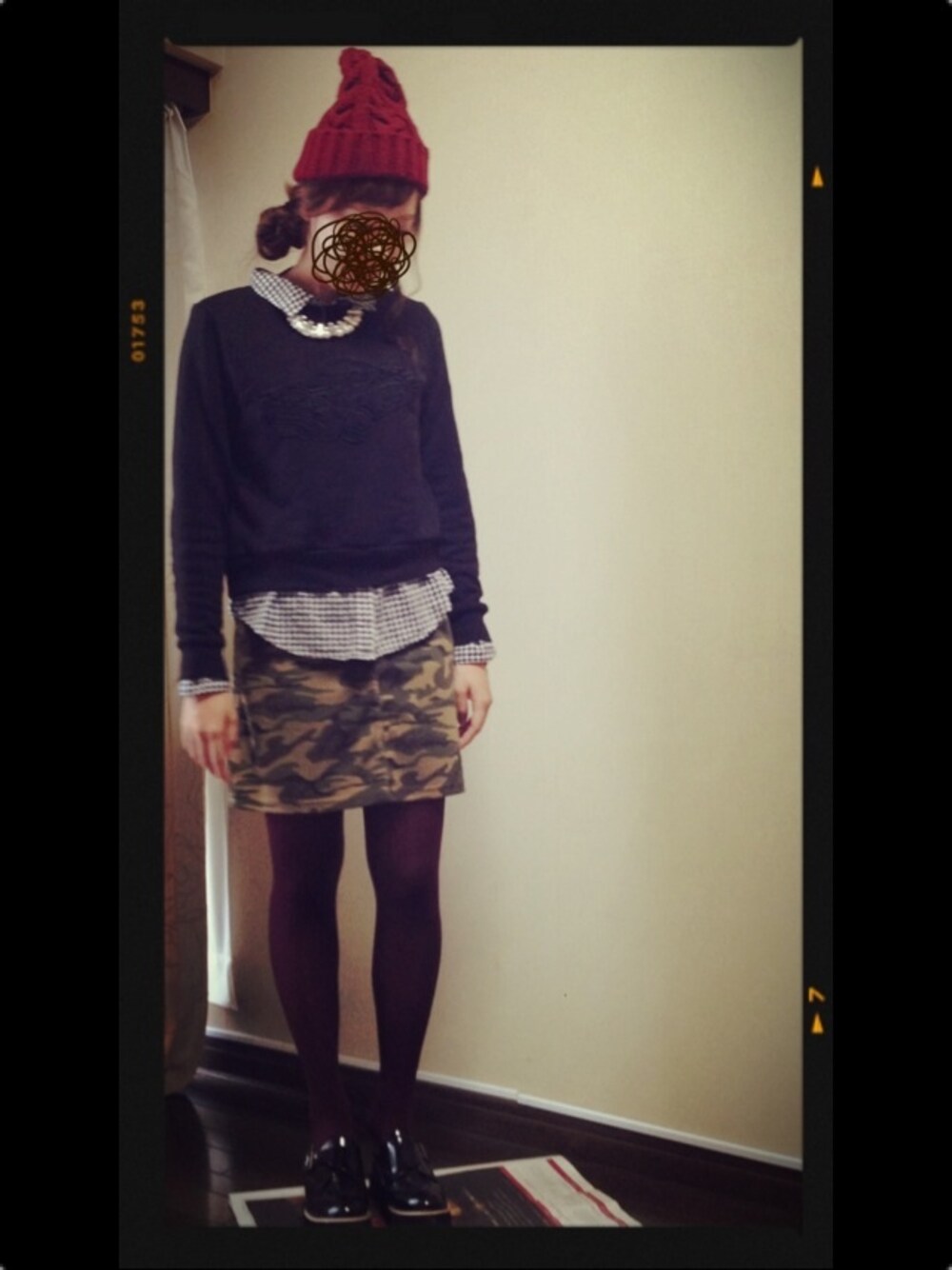 見てくださった方ありがとうございます♥ フォロー・セーブして下さった方もありがとうございます♥ ヘビロテしてるカモフラスカート♥ ギンガムチェックシャツ そして楽チンスエットTOPS そして秋はやっぱりボルドー 見にくいかもですがタイツもボルドーです。 大好きなもの詰め込みまくったコーデ♥ 今日は健康診断からのー 海鮮丼食べいく♥るんるんっ