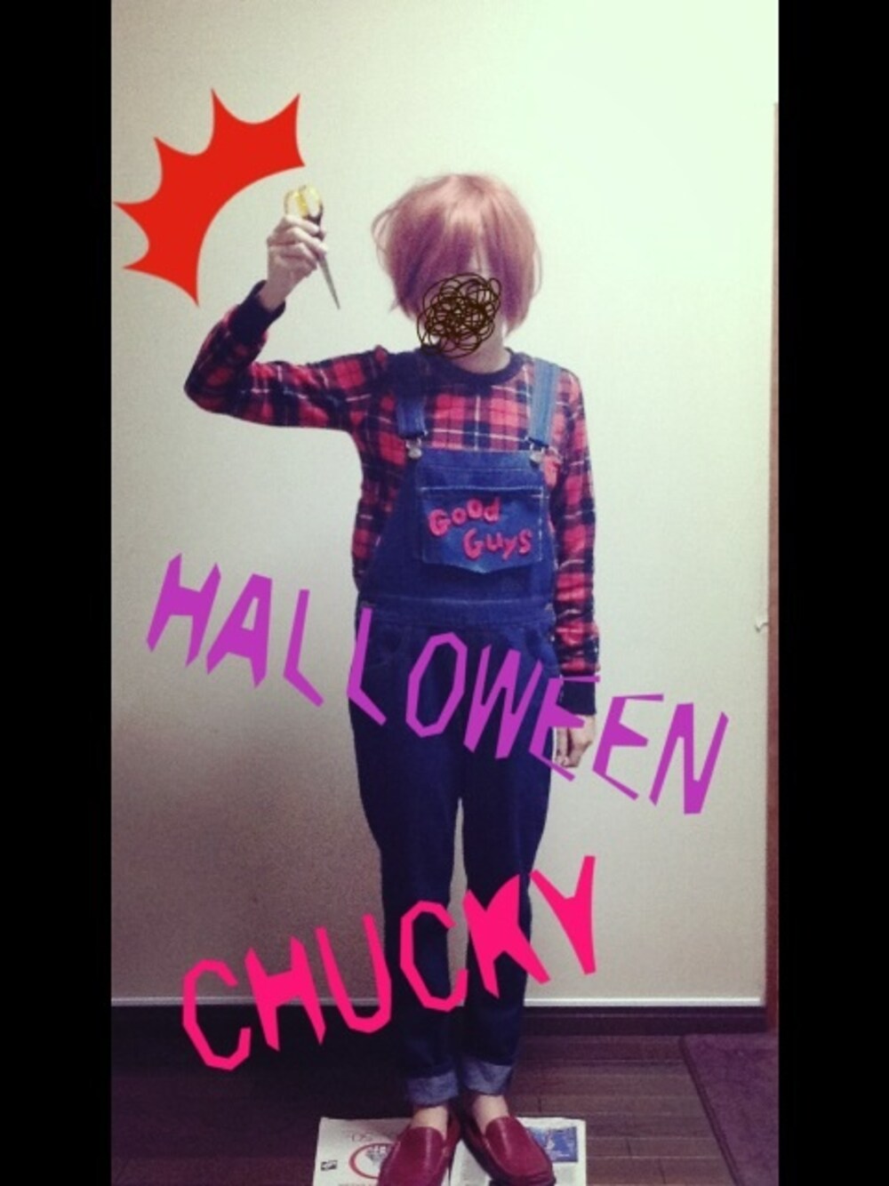 はっぴーはろうぃん 今年のハロウィンはチャッキー♥ チャッキーの着てるボーダートップス探しまくったけど全然なかった泣 サロペにフェルト切ってつけたのん このウィッグ500円なのにナチュラル ハロウィンやる日はグロ傷シールに血糊偽ナイフ でいくぜー(ノ∀`笑))わくわく
