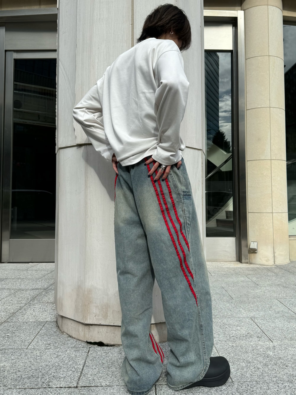 プリン少納言のデニムパンツ「【ユニセックス】Side Wave Line Denim Pants / サイドウェーブラインラインデニムパンツ」を使ったコーディネート