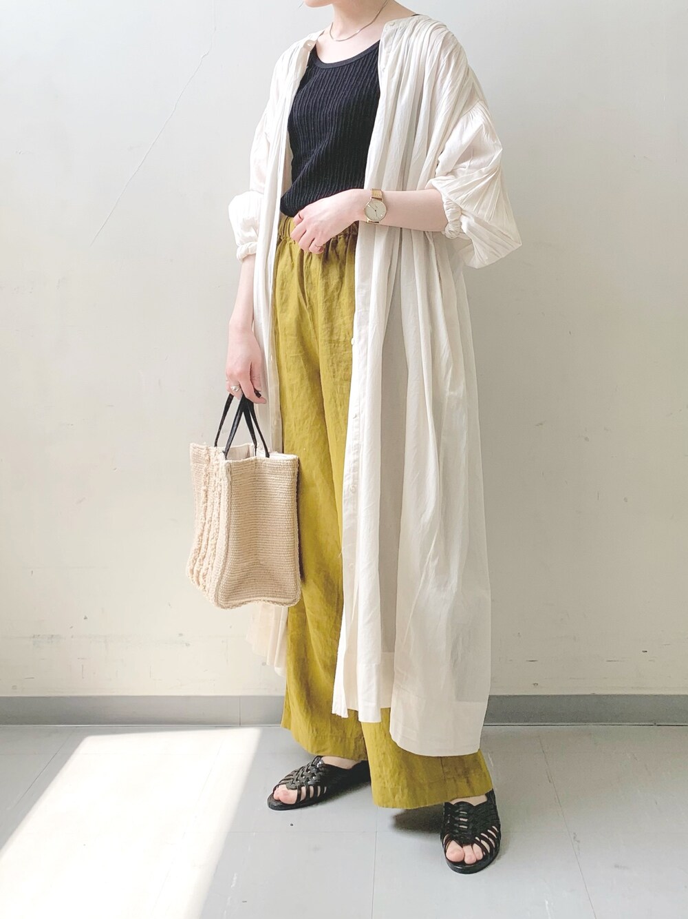 リネンパンツが主役のコーデ🌿 パキッとしたカラーでも リネンの風合いで優しい雰囲気に♩