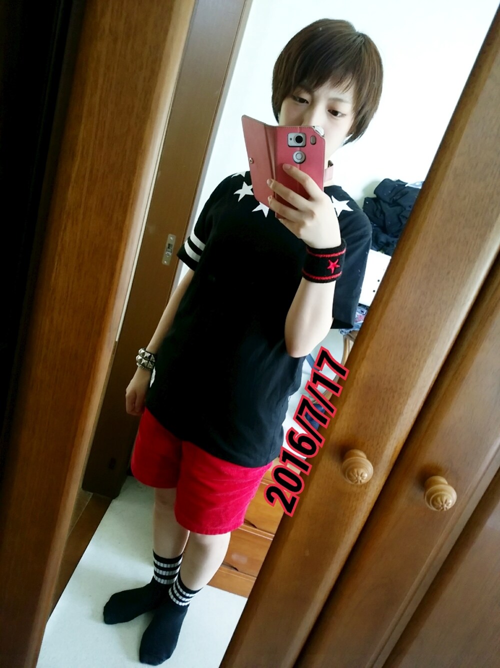 安定の黒Tシャツに赤ハーフパンツ 黒と赤の組み合わせ好きだし リストバンドも同じ配色なので 統一感が出ると信じてる。