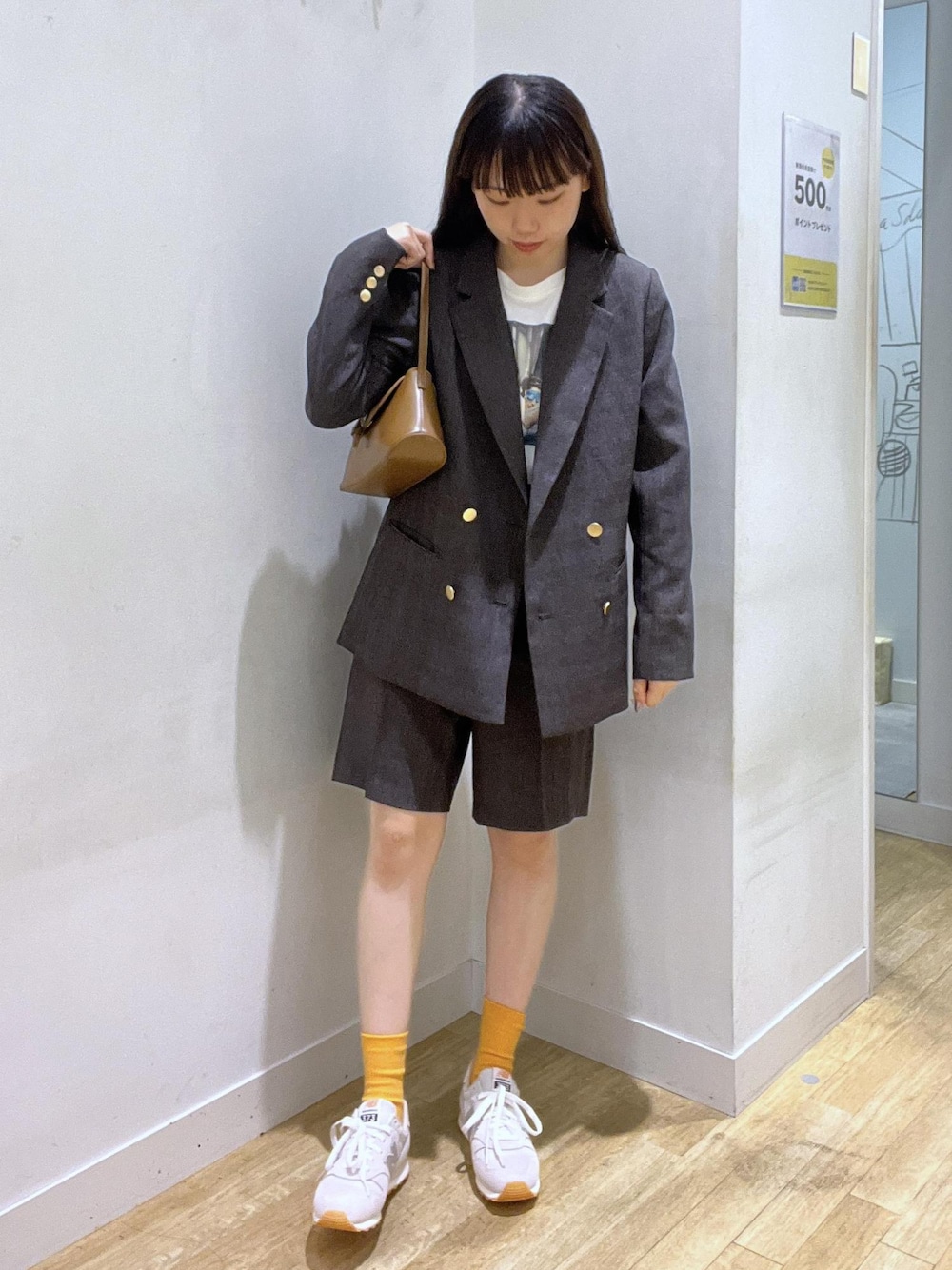 ジャケットのセットアップにプリントTシャツと足元を スニーカーにすることでカジュアル感をプラスした コーディネートです