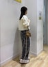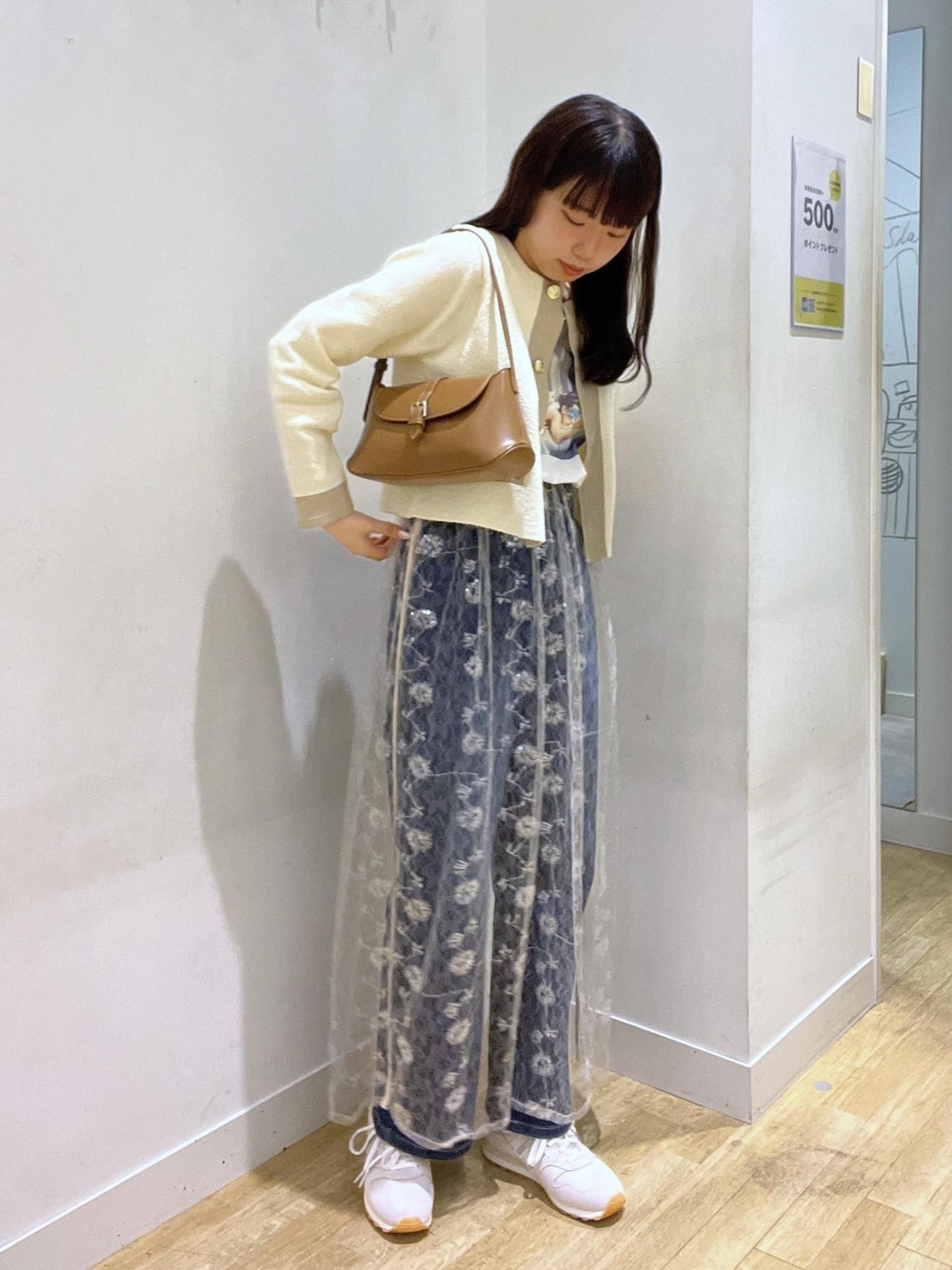 ショート丈のカーディガンにデニムとスパンコールスカートを 組み合わせ、韓国風であり今っぽいカジュアルコーディネート に仕上げました