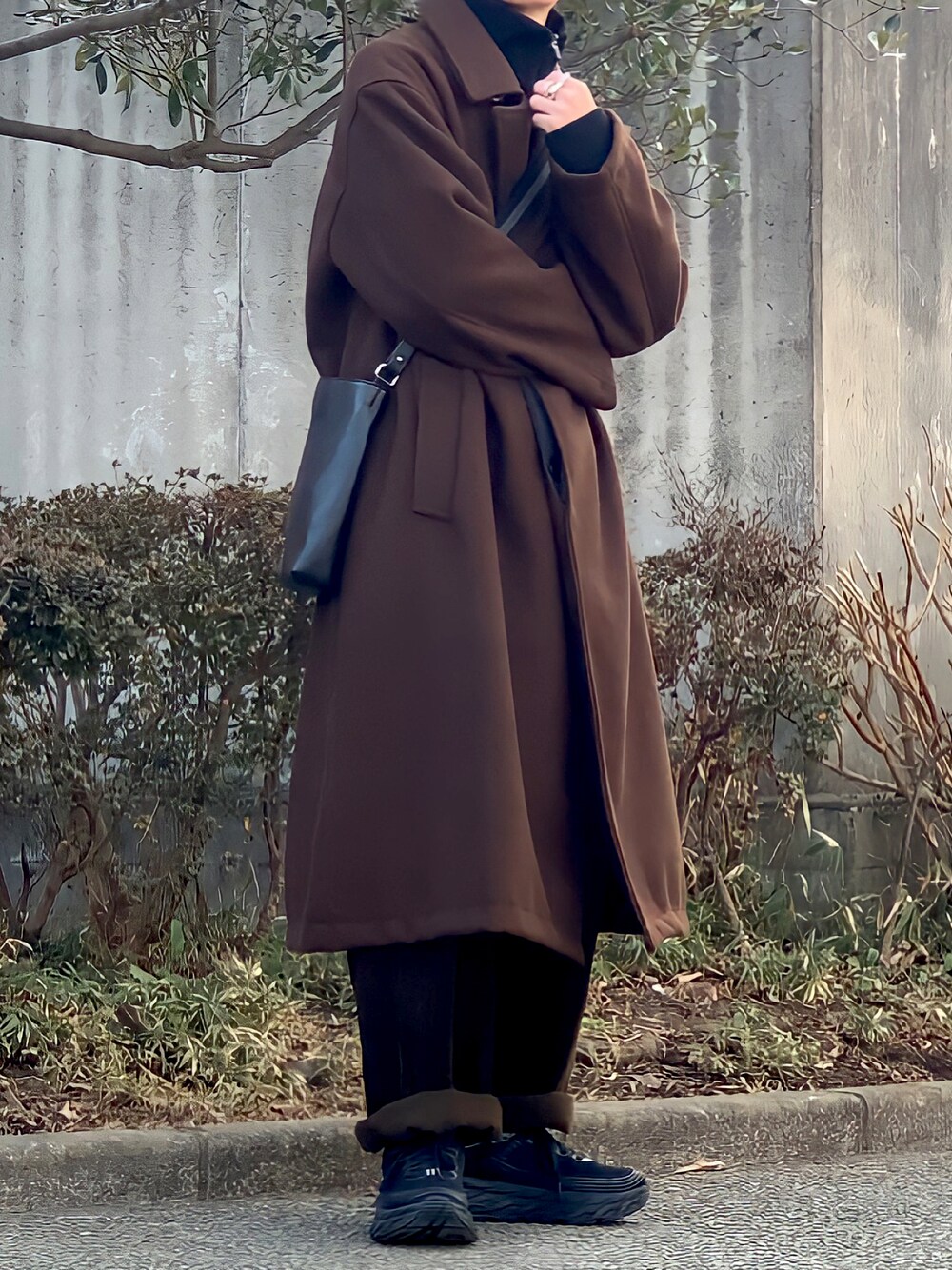 みっち~のステンカラーコート「オーバーサイズ ラグランスリーブ ロングバルマカーンコート/メルトンステンカラーコート」を使ったコーディネート