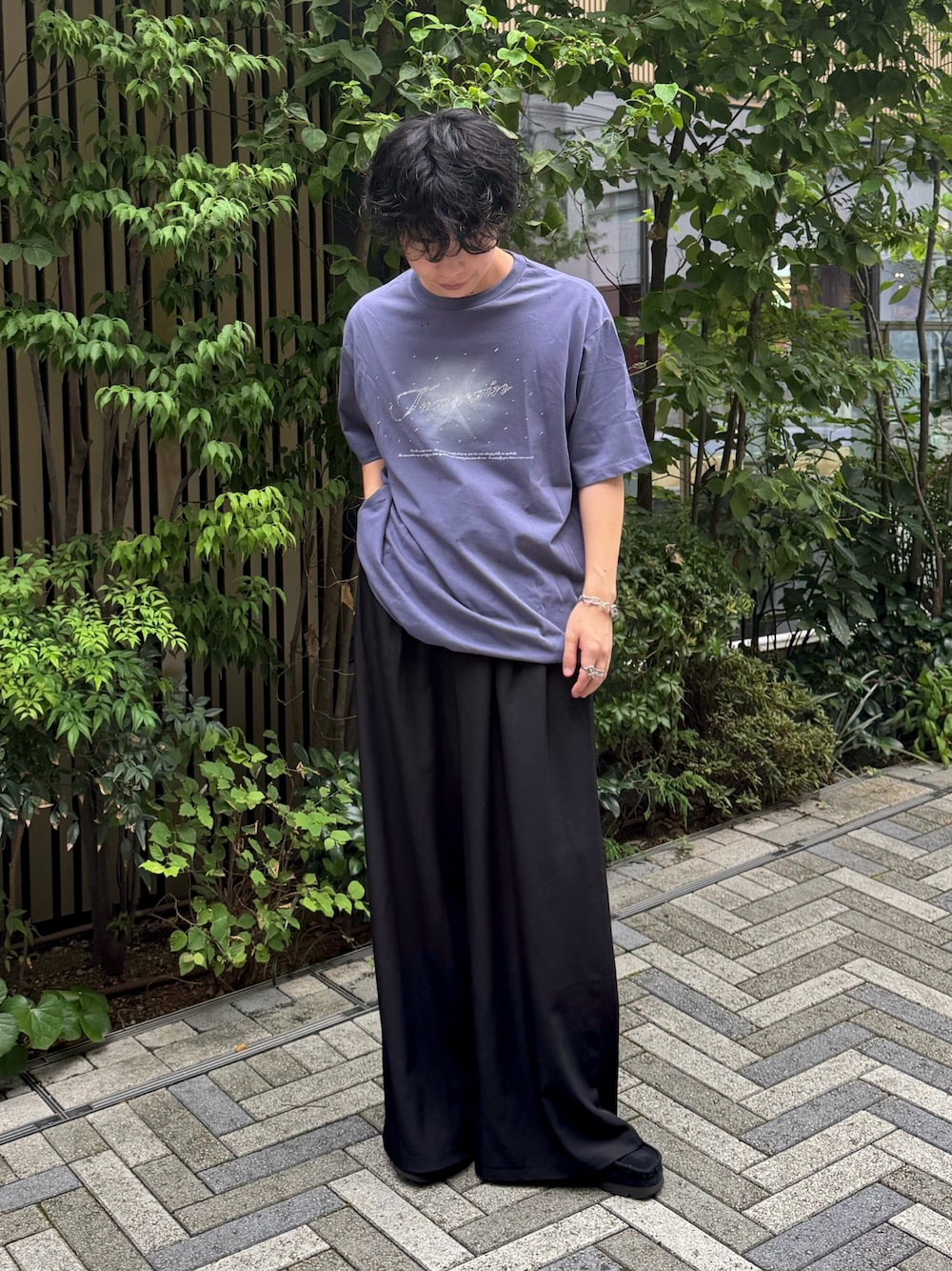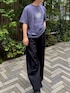 シンプルなロゴTシャツで目をひく 黒スラックスが逆に映える