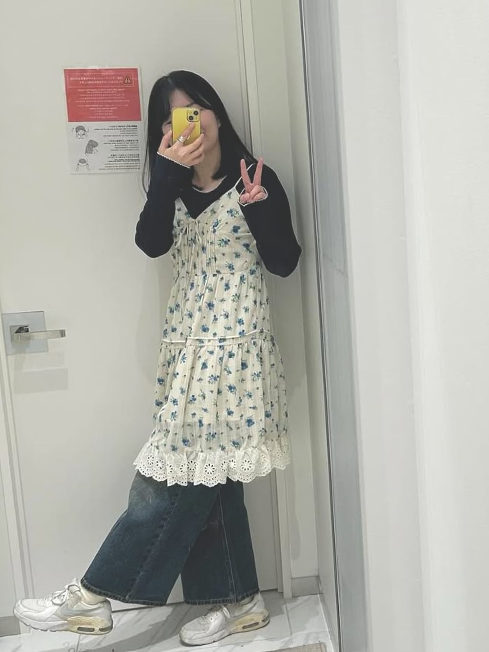 可愛いワンピースにハートのダメージがあるデニムを合わせました♡