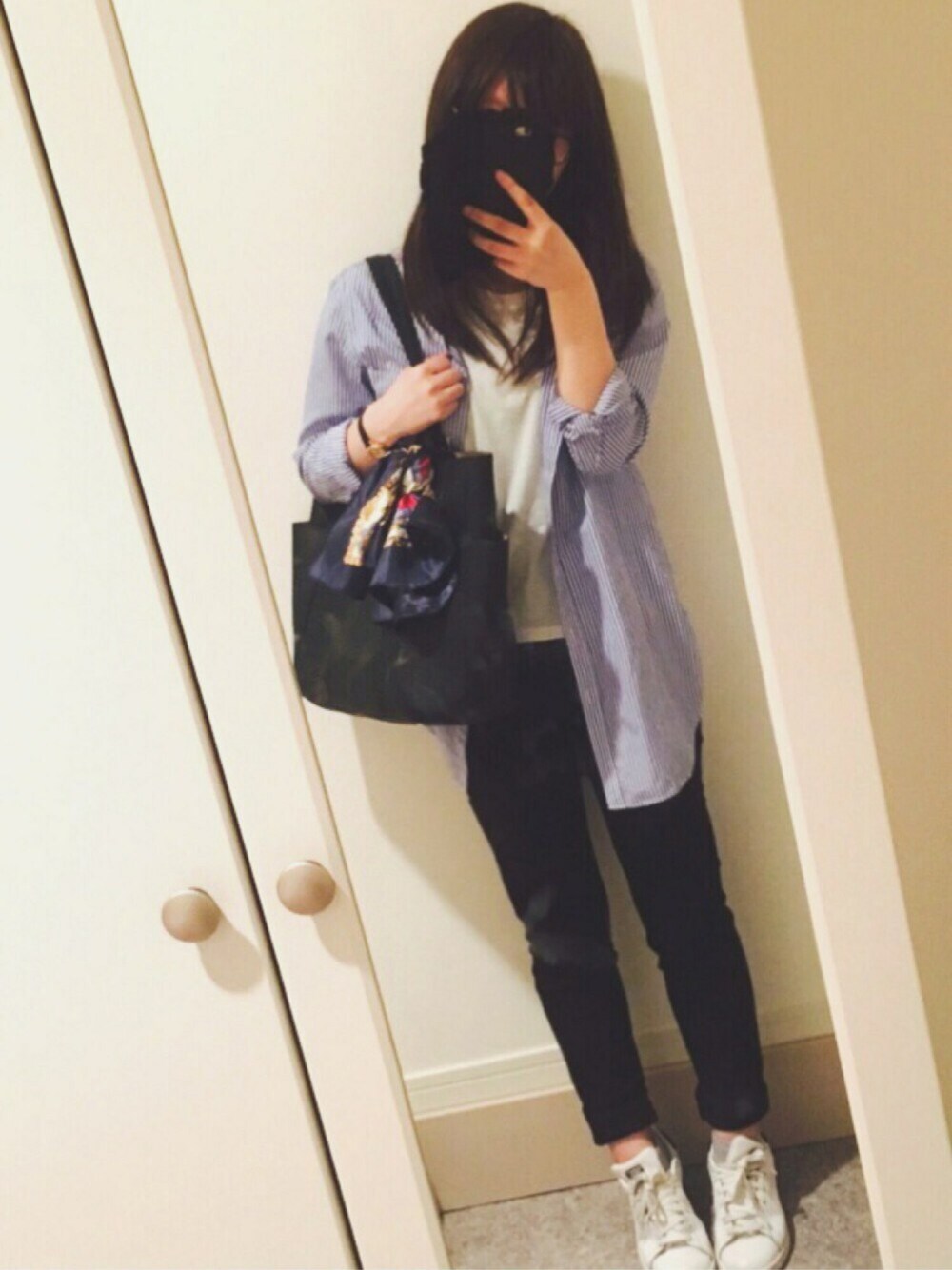 閲覧ありがとうございます🌝💜 高校生の時(約4年前?)に買ったUNIQLOのメンズシャツが社会人になった今、通勤服として活躍してます(笑)お尻まで隠れる大きめシャツがお気に入りです❕