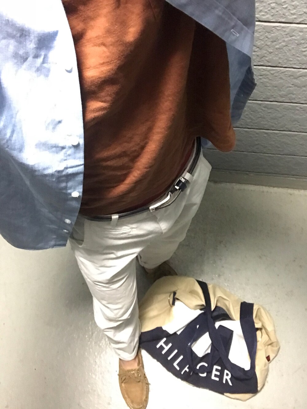 茶色と水色のトップス決めて、 あとはそれに合わせて白パンツと茶デッキ。