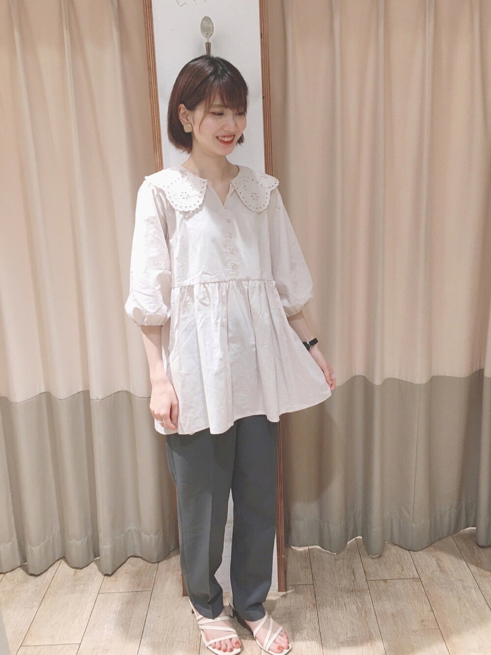 B.L.U.E.ペリエ稲毛のnanaです🌷 ブラウスにセンタープレスパンツを合わせました🌻 ブラウスはウエスト切り替えになっており、ふわっとしたシルエットでとても可愛いです♥️ 襟が大きめですが、首元が少し空いてることによってガーリーすぎず、スッキリしたパンツと合わせるとバランスがいいのでオススメです😘✨