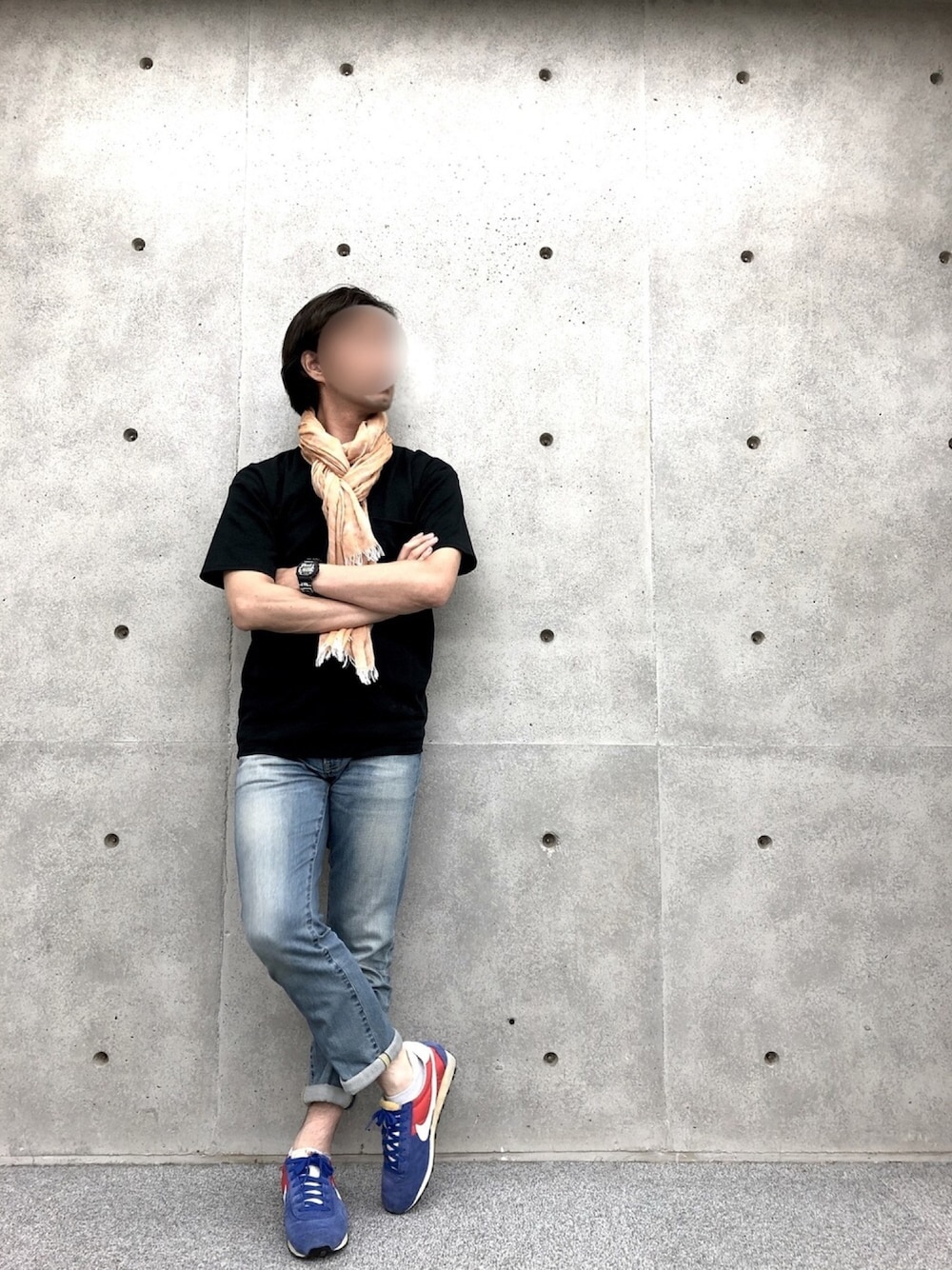 デニムスタイル。 スニーカーは、赤がオシャレなローテクで。  ワッフルソールがこなれ感を勝手に演出してくれますね😅 首元が寂しかったのでストールを。