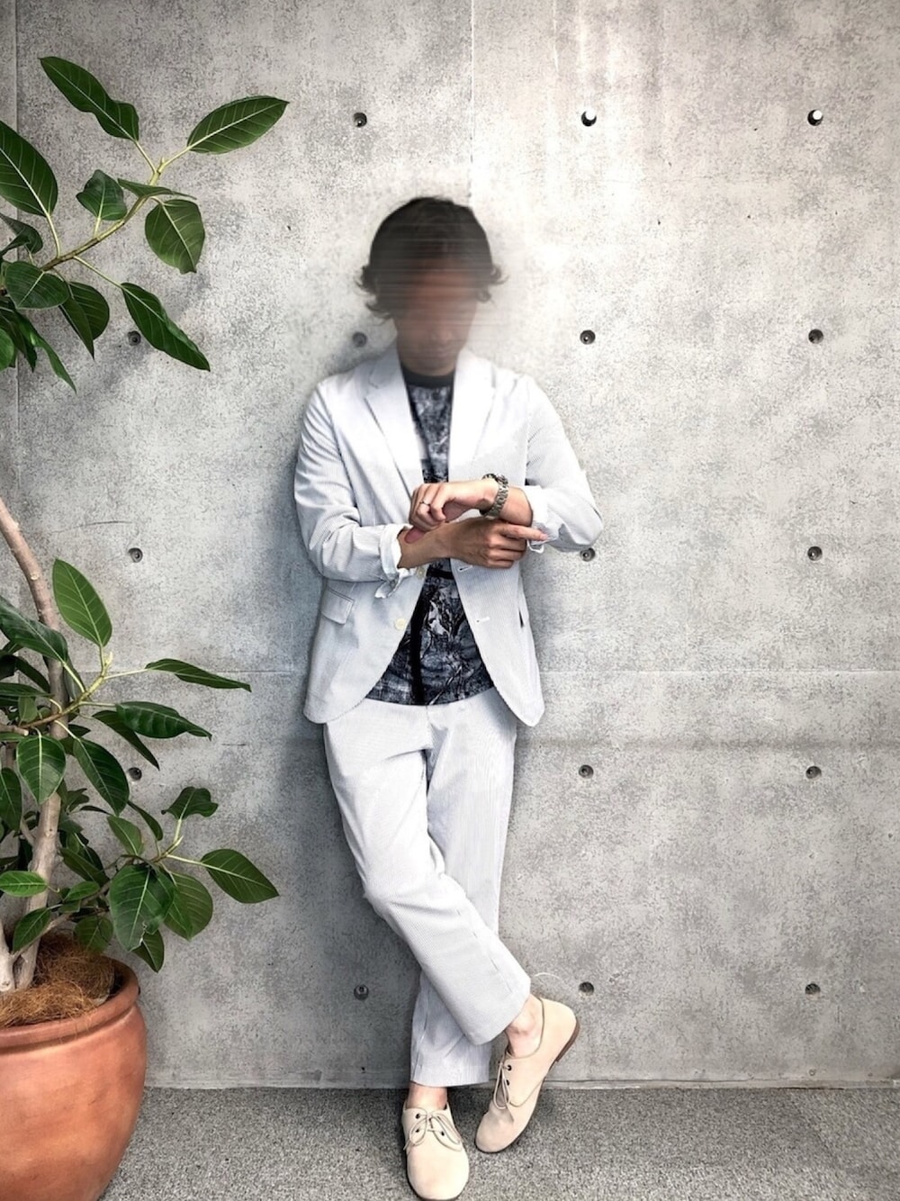 シアサッカーのセットアップスタイル。 レペットタイプのシューズはチャレンジして合わせてみました…。😅 イマイチ…。ですかね。😅😅