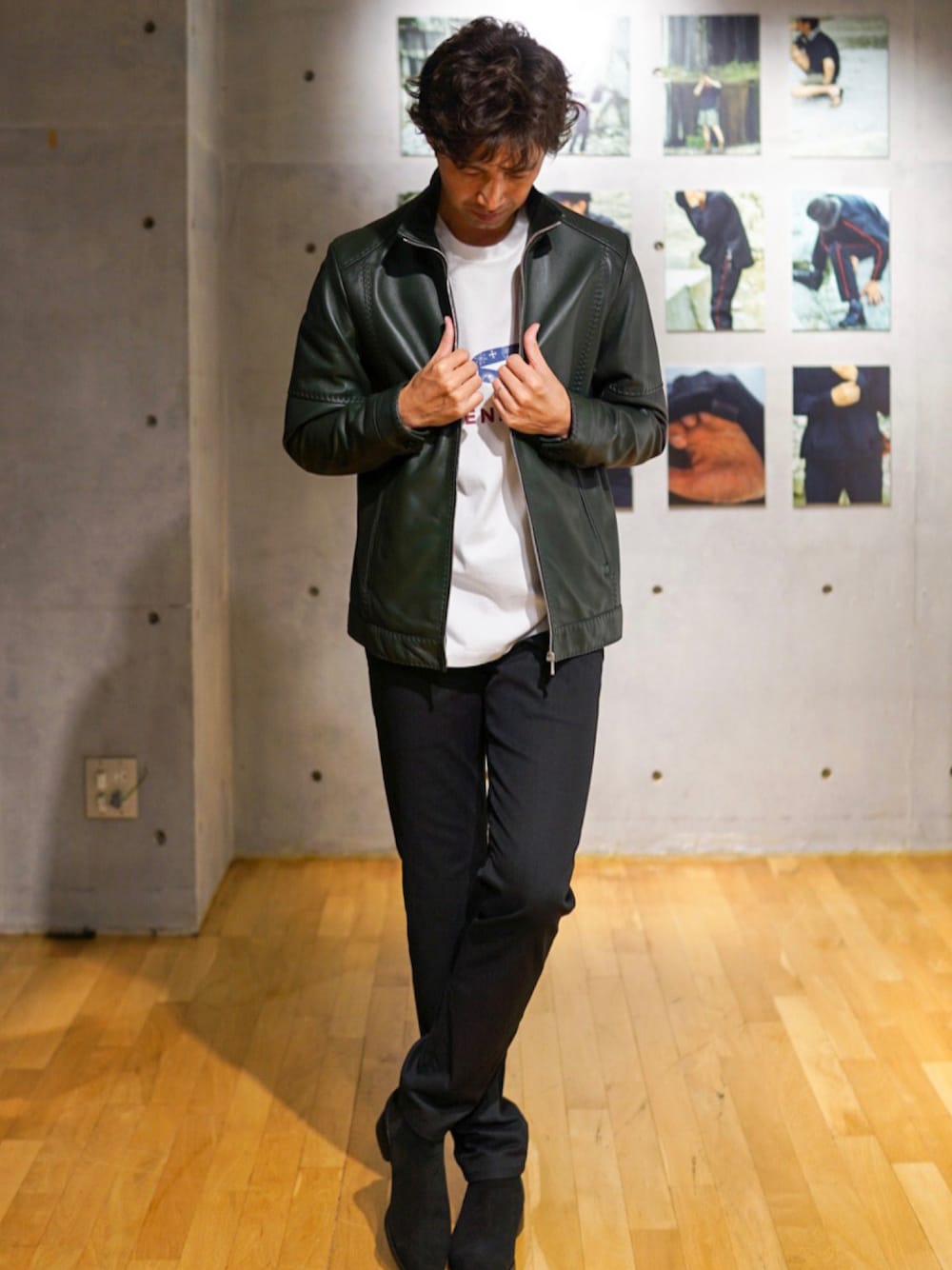 スタンドカラーライダースジャケット。 チラッと見えるインナーのDENHAMが いい感じ。 私は1サイズ大きめに03(L)サイズを着用していますが、ジャストは02(M)サイズです!ご参考まで。