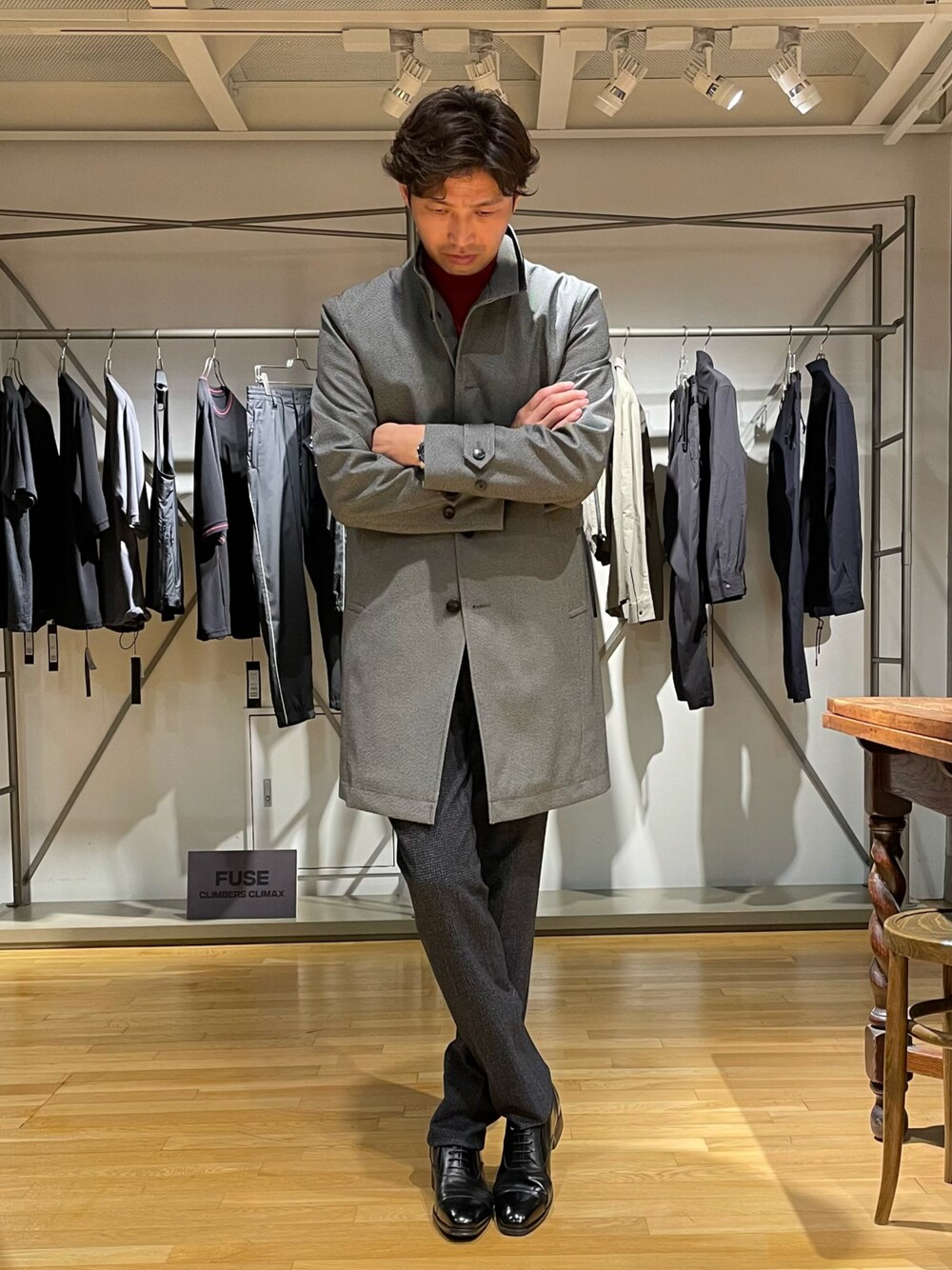 2ndbmのチェスターコート「スタンドカラーバーズアイボンディングコート」を使ったコーディネート