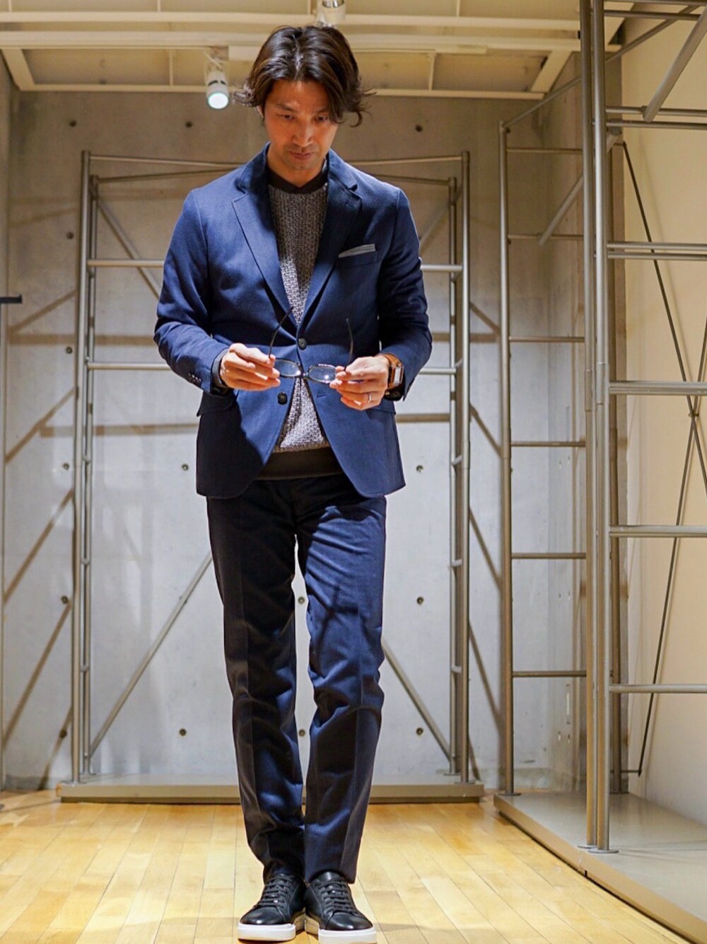 ネイビーセットアップスタイル。 インナーはトレーナー型で、洗濯も楽ちん。