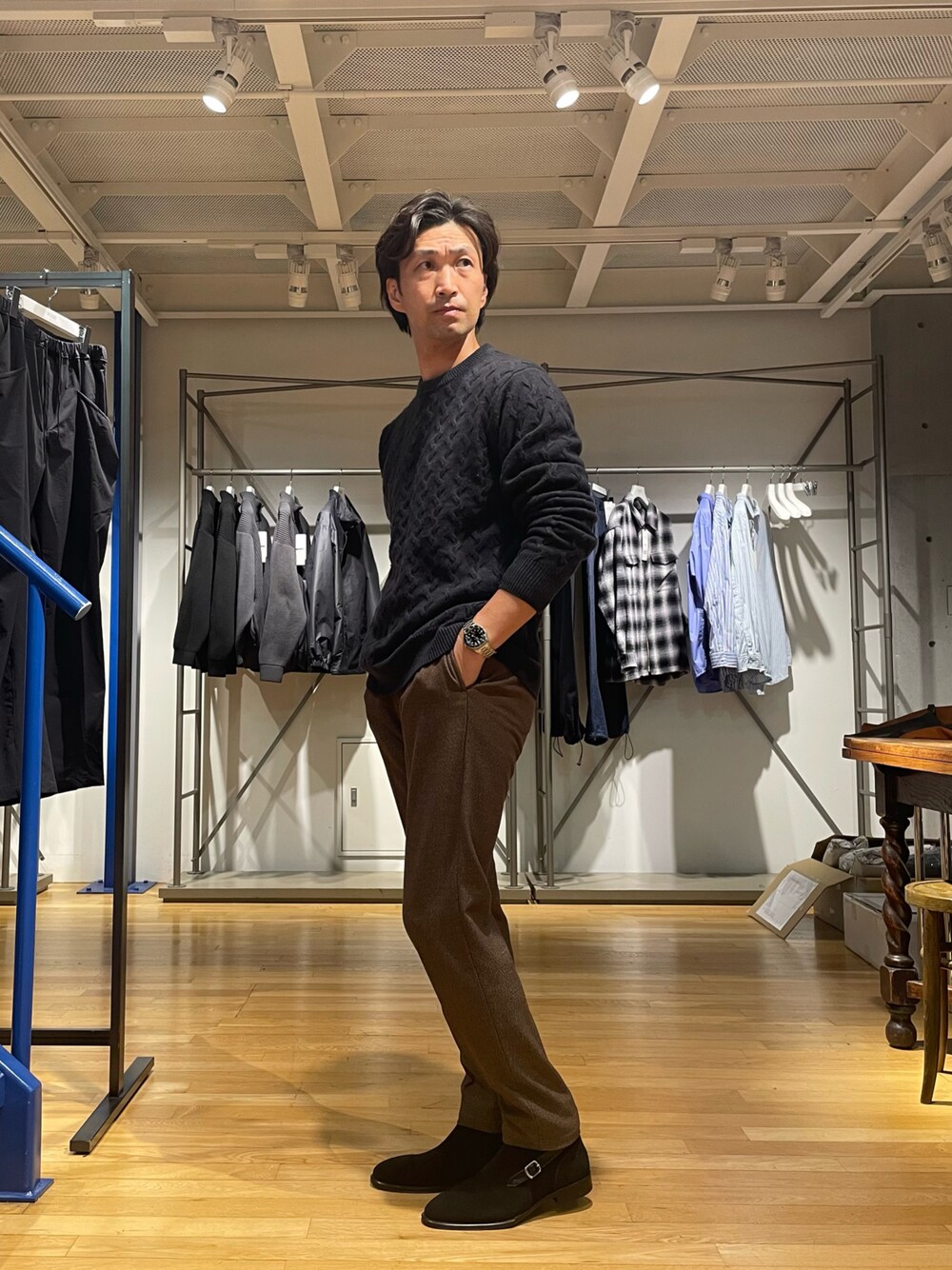 MEN'S BIGIの上質なケーブルニットを着用。 大人のカジュアルスタイル。 アウターを脱いでもオシャレを。^_^