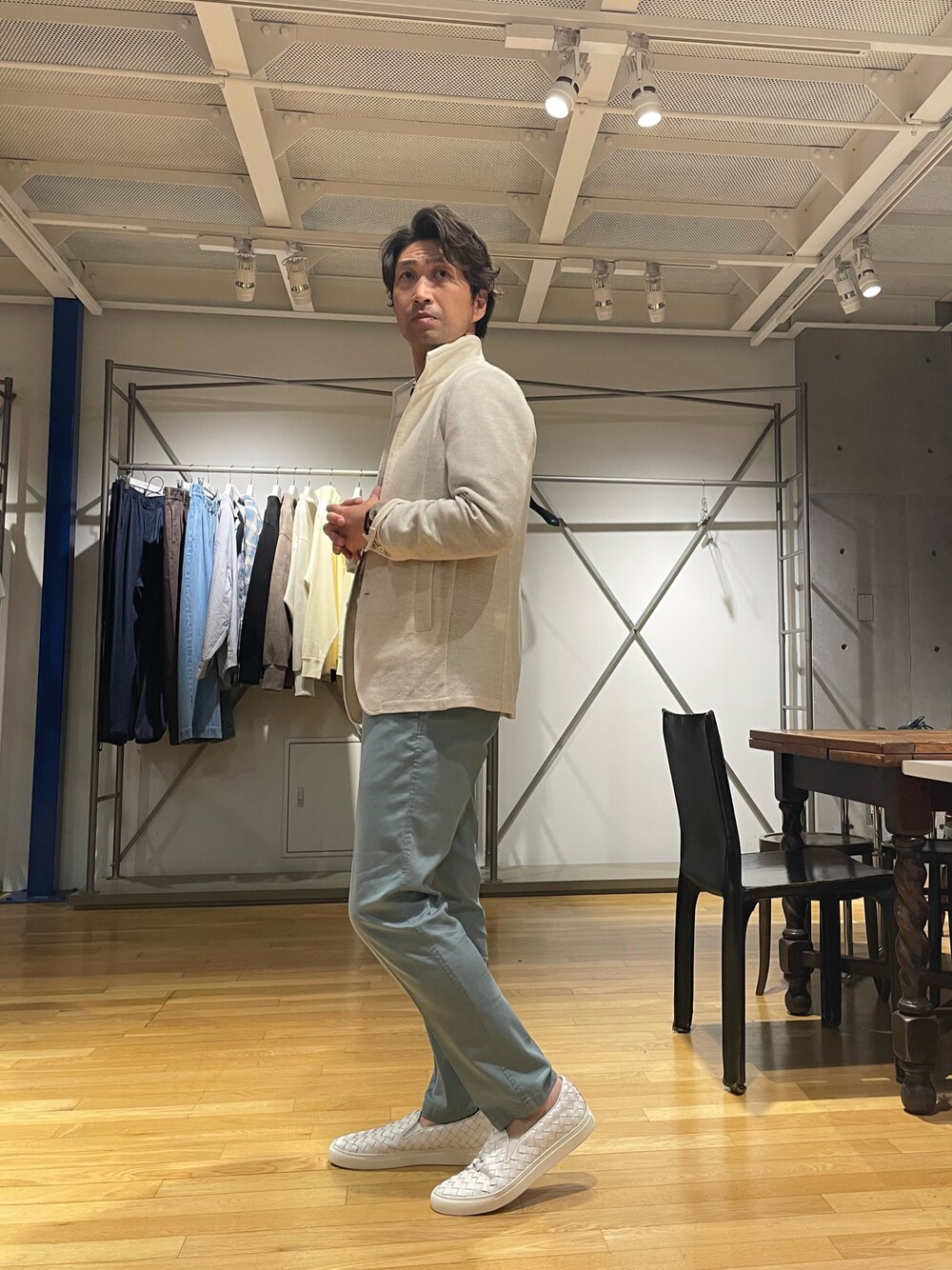 トップスのオフホワイト系とシューズのカラーリングを合わせたスタイリングがポイントです。