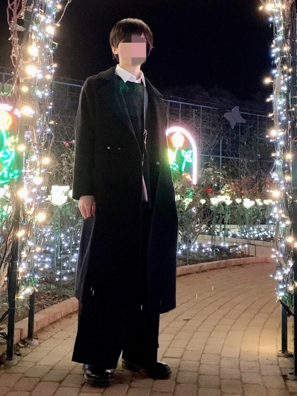 ブラック系のチェスターコートを着用したメンズの冬コーディネートの1枚目の写真